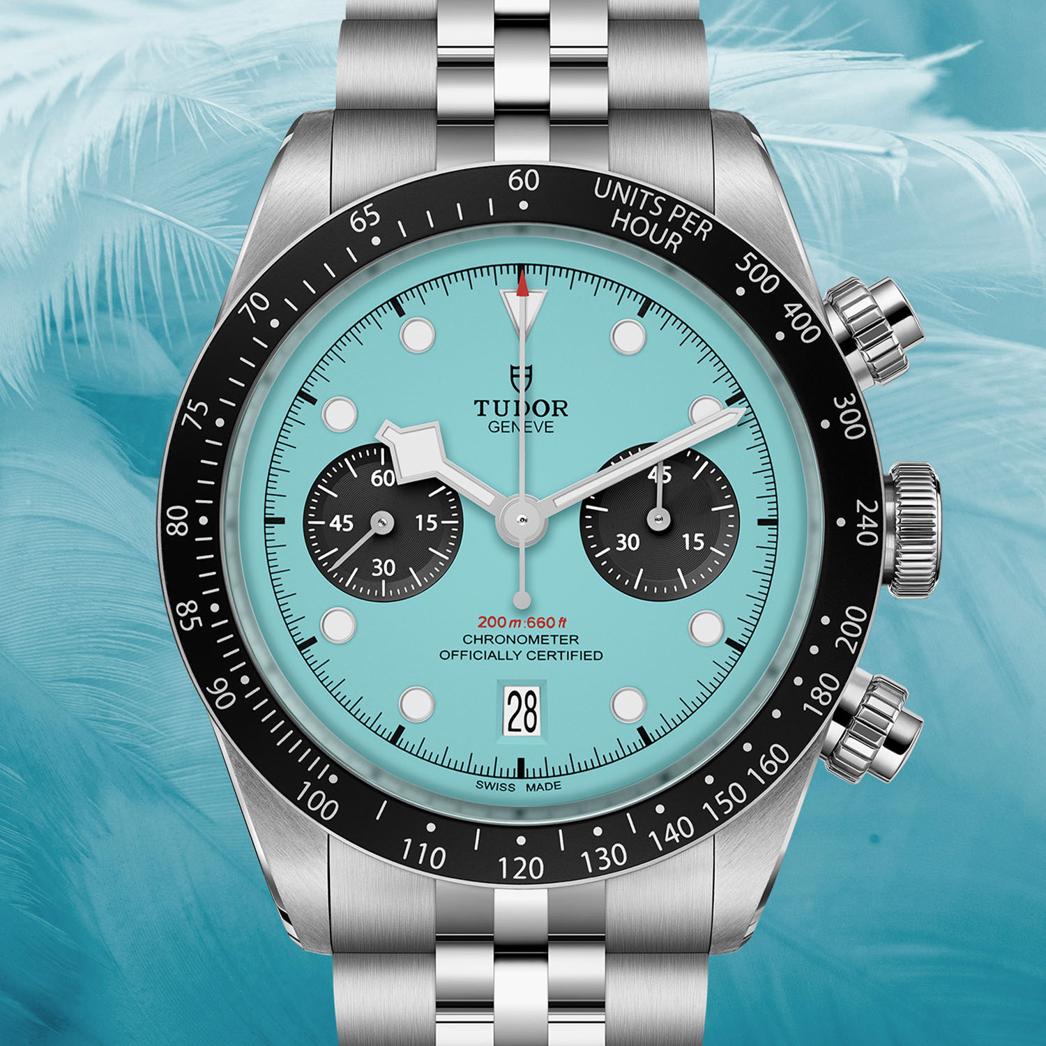 What’s new then… Well, the obvious evolution on this Tudor Black Bay Chrono Flamingo Blue is the colour of the dial. Just like the Black Bay Chrono Pink, this new edition plays on bright summery tones – the Miami vibe – with a turquoise (should we call it a bit Tiffany…? yes it is) colour. Like the pink edition, it’s paired with a black aluminium tachymeter scale and black sub-counters for the chronograph and small seconds. The date is done in white and all markers and hands are rhodium-plated and filled with white Super-Luminova. So why Flamingo Blue…? Maybe a reference to the tropical waters flamingos are known to love…? Who cares, this new edition once again looks fresh and cool, and I have no doubt about its immediate and future desirability.