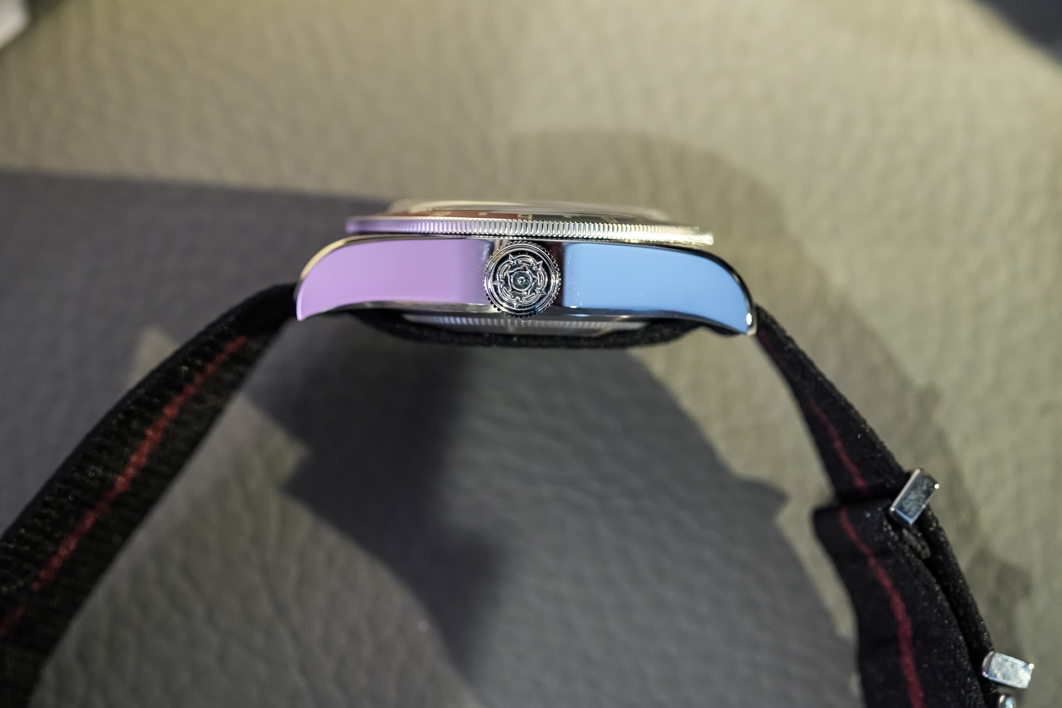 But no, Tudor has not applied any of these updates and kept the Black Bay GMT Opaline identical to the black version. It doesn’t make it a bad watch. But I would have loved to see incremental upgrades applied simultaneously on this objectively very cool dial. Let’s do a quick recap. First released in 2018 with a black dial, alongside Rolex’s take on the GMT Pepsi watch (both at Baselworld 2018), the Black Bay GMT is a mix between diving credentials and travelling capacities – a combination that I’ve always appreciated, making some of the best all-rounder sports watches. Housed in a rather large steel case of 41mm, it followed the design of the non-GMT models, with an oversized crown, a visible winding crown tube, chamfers on the sides of the lugs and a bidirectional bezel with now 24h scale printed over a blue and burgundy “Pepsi” anodized aluminium insert.