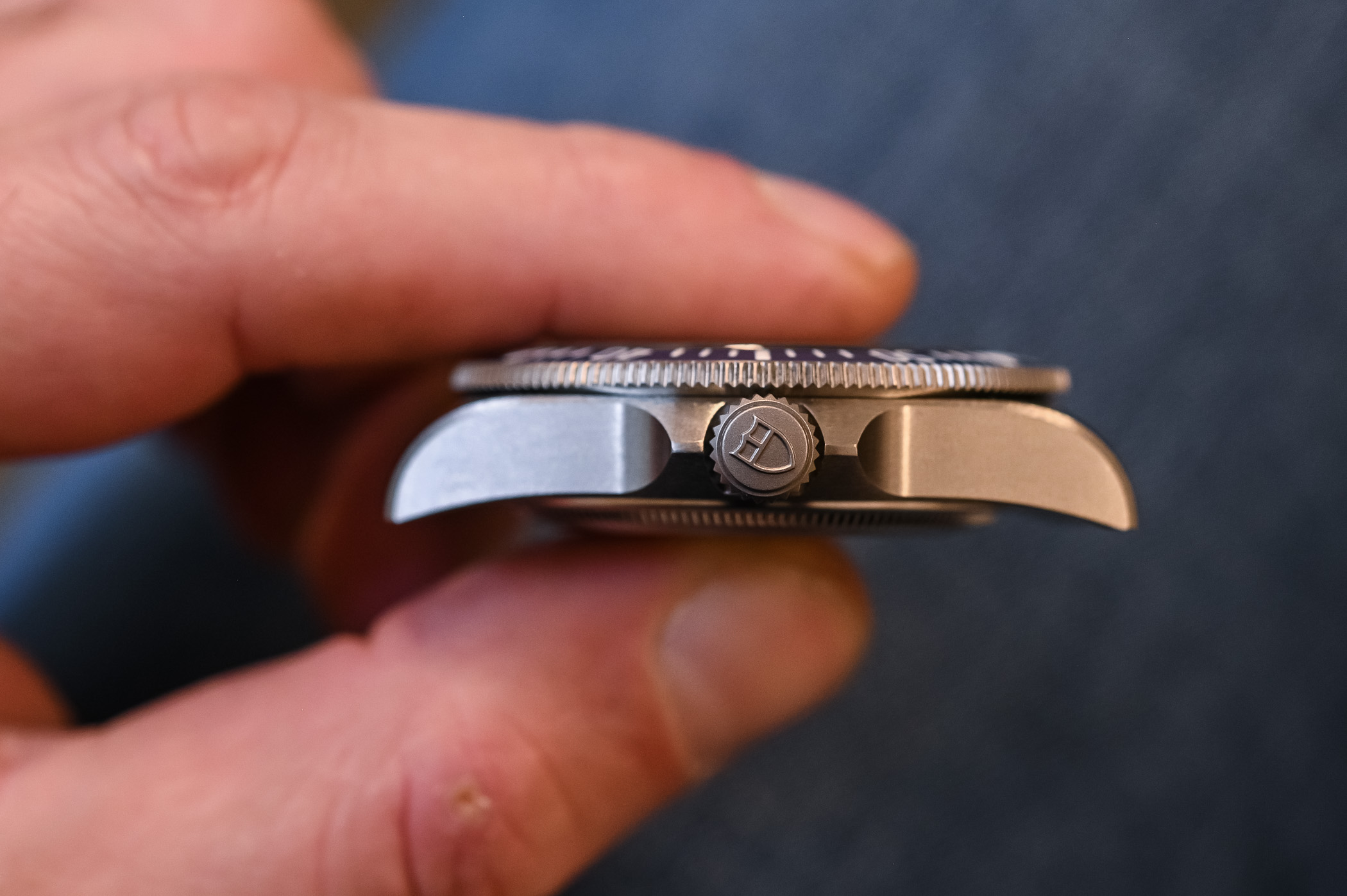 Then comes the real point of difference: the lugs. Indeed, the Tudor Pelagos FXD brings back the concept of fixed strap bars that were once used on mil-spec watches. But instead of basic soldered bars, Tudor has developed a module that ensures comfort and robustness. The case and the lugs are milled from a single block of titanium, and these “loops” on the back ensure that the whole case will resist pretty much anything you can imagine – no risk of the bars breaking here. And coincidentally, to make sure that these loops won’t cut the strap, all the surfaces have been bevelled to smoothen the angles. You can look at the watch from any perspective; it really feels like an overly-engineered piece of equipment, with no room for approximation.