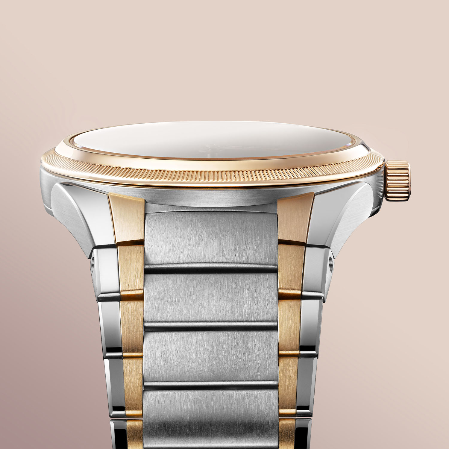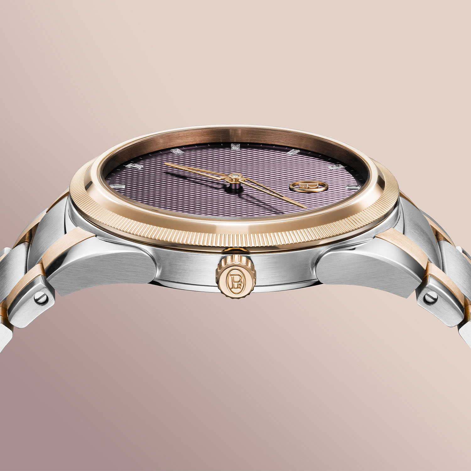 The new model comes in an attractive two-tone stainless steel and 18k rose gold case and bracelet. Used to accentuate specific design details, rose gold is featured on the signature knurled bezel, the crown, and on the second and fourth links of the integrated bracelet. Sharing the 36mm diameter and slim 8.6mm height of its more compact siblings, the case features Michel Parmigiani’s beautiful teardrop-shaped lugs and is decorated with a mix of brushed and polished finishes. Fitted with a screw-down crown, the case lives up to its luxury sports watch classification and is water-resistant to 100 metres.