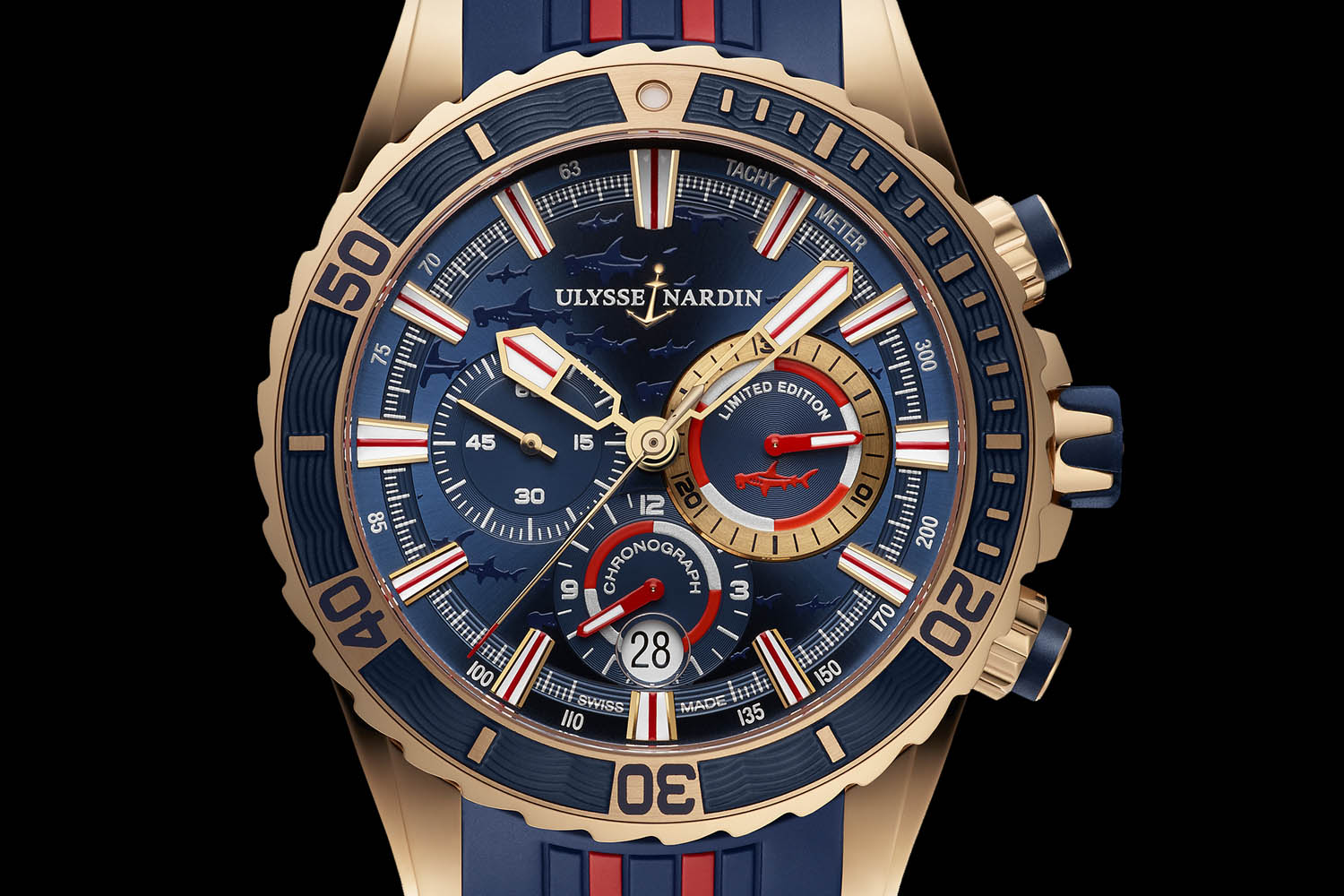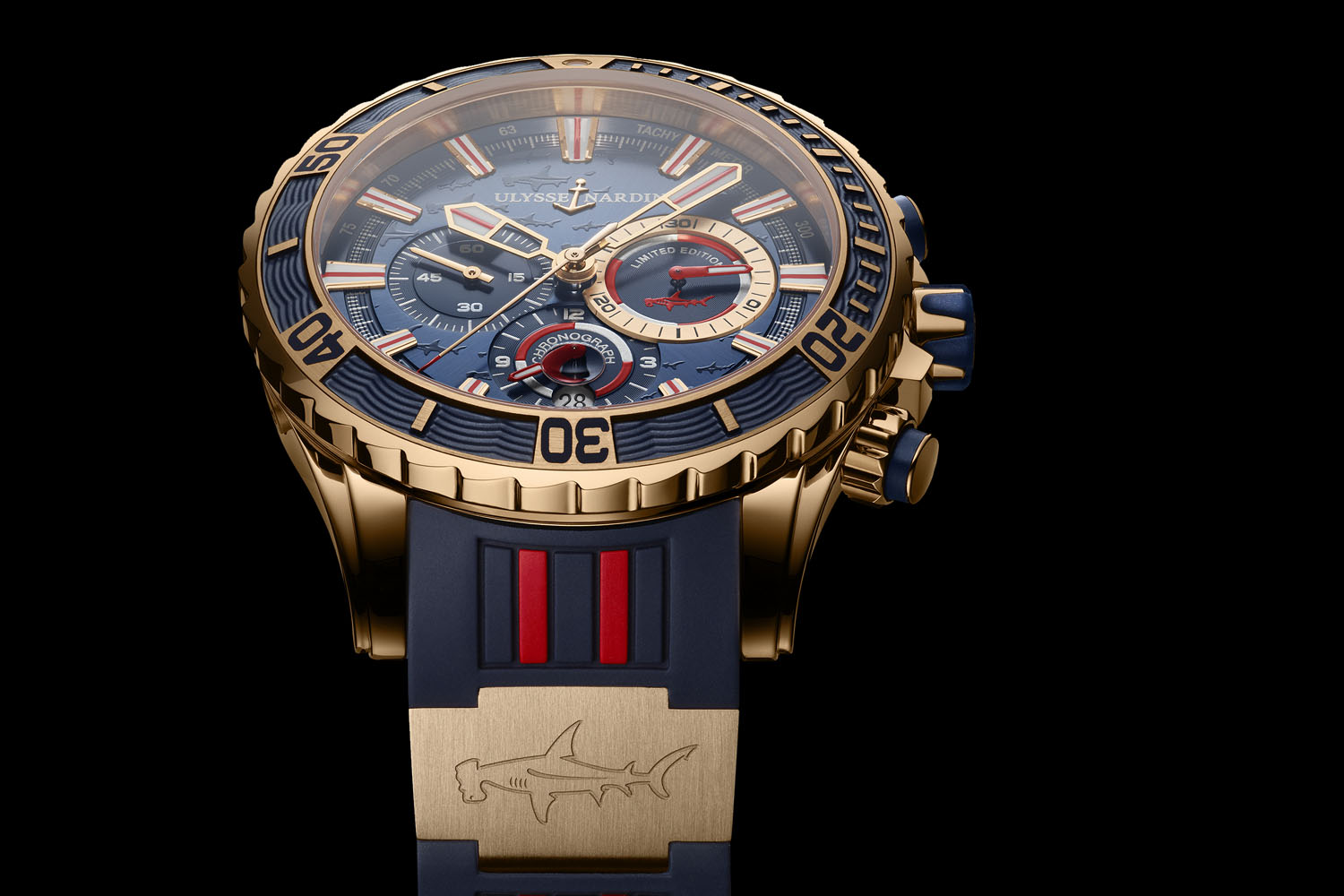 Both editions of the Ulysse Nardin Diver Chronograph Hammerhead Shark, whether in steel or gold, play with a mix of deep blue with red accents. The dial, specifically on these limited versions, feature a hammerhead shark motif – logo that can be found on the strap inserts and into the 30-minute sub-dial. The layout of the dial is classical – a 3-6-9 chronograph with date at 6 – but highly legible. The hands are bold, the minute recorder of the chronograph is emphasized and the markers are luminous. Several touches of red help to quickly understand the functions and the indications.