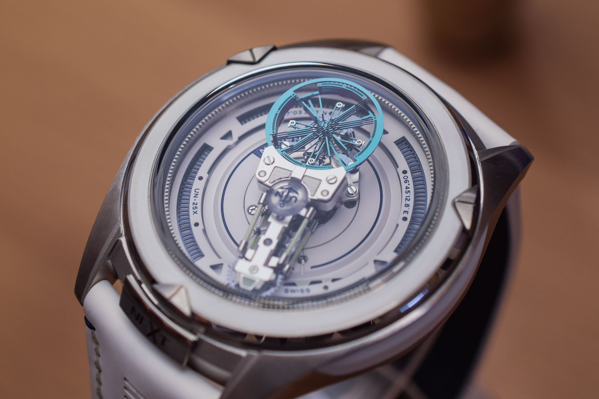 The innovative UN25X movement features an attractive, high-tech look. The bridge holding the baguette movement comes in a trapezoidal shape framed by luminescent tubes filled with Super-LumiNova. The oscillator stands out with its vibrations, high-tech architecture and its changing colour (because of the silicon oxide layer). The hours are indicated by a luminescent indicator making a complete rotation in 12 hours.