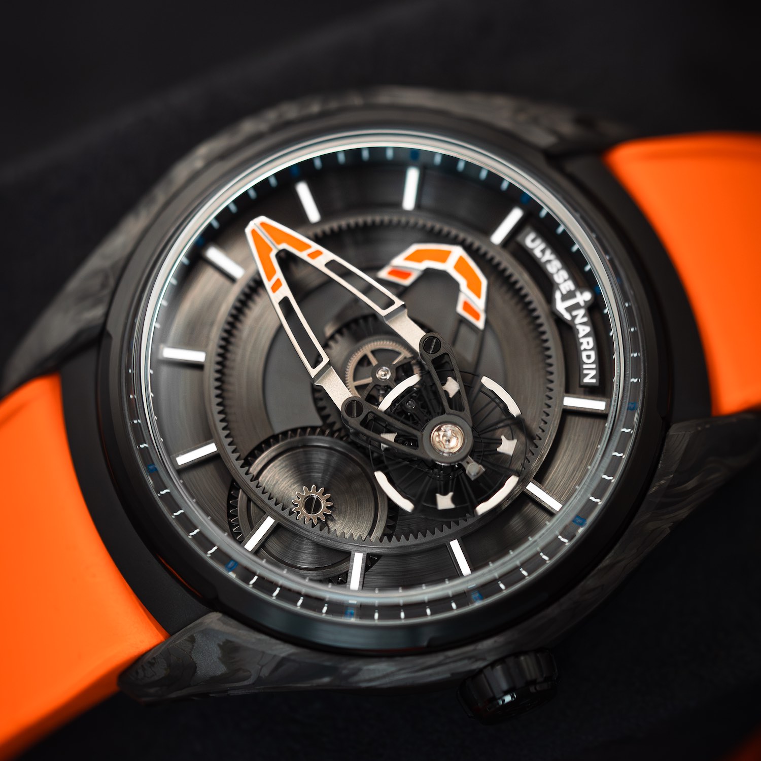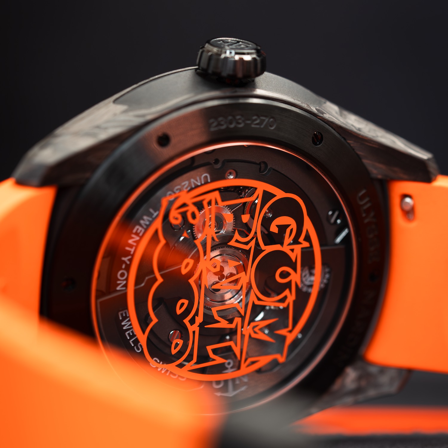 To celebrate the Gumball, Ulysse Nardin elected the Freak X, the most casual Freak and the entry point into the Freak universe. For the occasion, the model’s 43mm case is made of black DLC titanium with side parts in black carbonium with a matte finish. The black case and movement are accented by orange Gumball touches: iridescent orange Super-LumiNova for the hour and minute “indicators” and a vivid Delugs orange rubber strap. Turning the watch over, the display caseback is emblazoned with the Gumball 3000 logo.