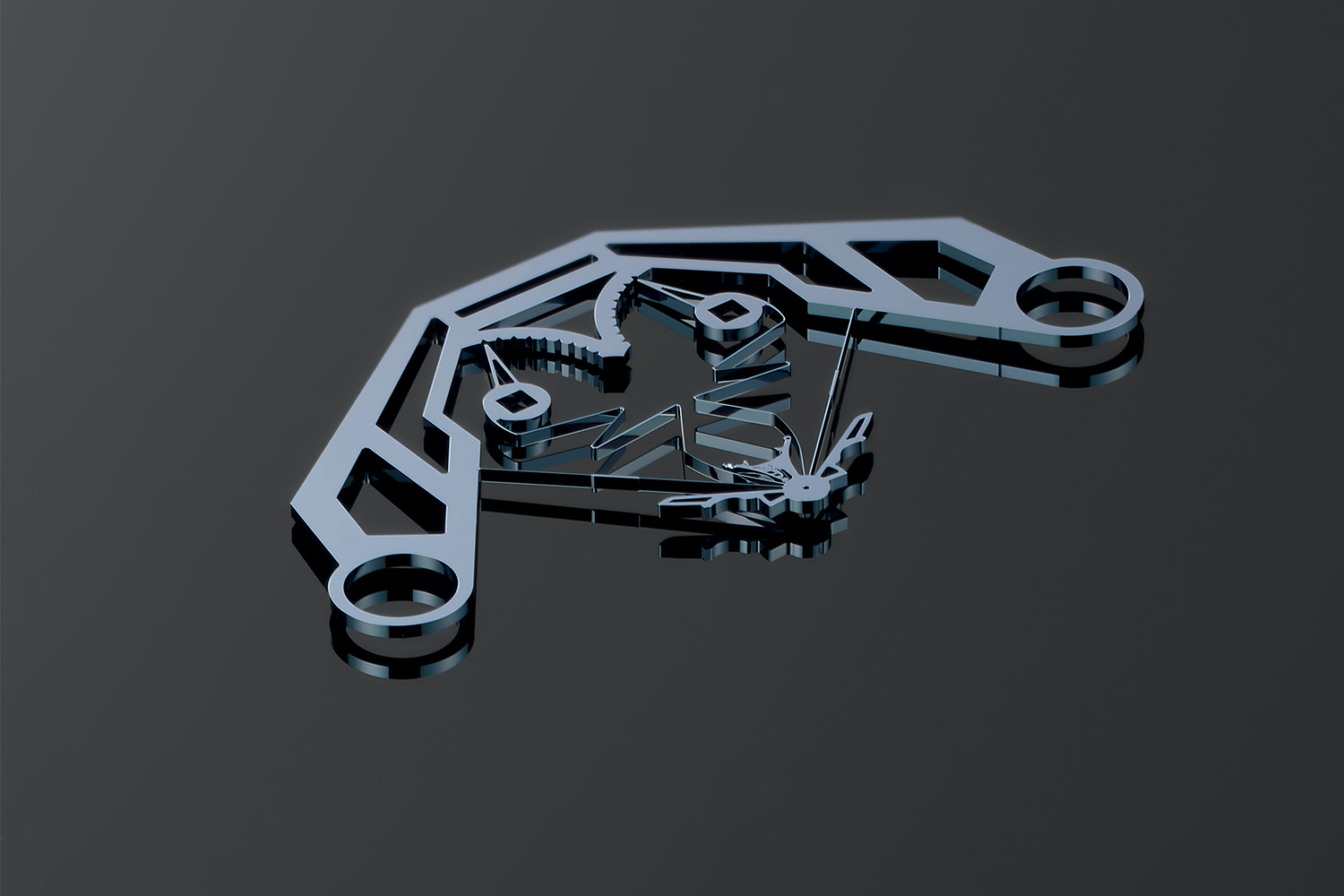 An innovation in production technology, the strategic silicon component of the escapement involves silicon bonding as the complex, three dimensional shape of this part requires a two-part production process, which is unprecedented for small horological components. A vertical bond is created by compressing hydrophobic surfaces at process temperatures of between 1000 to 1200 degrees Celsius with the addition of oxygen.