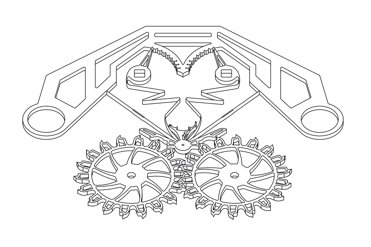 The Dual Constant Escapement is a hybrid between the Dual direct escapement (2001) and the Ulysse Anchor Escapement (2014). Like in the Dual Direct escapement, which aims at improving efficiency, two escape wheels alternatively interact with a cleverly designed part with locking elements, to alternatively transmit impulses to the balance wheel. Like in the Ulysse Anchor escapement, it is using the potentialities offered by flexible silicon blades to create a sophisticated constant force escapement. A holy grail of watchmaking, constant force aims at achieving constant amplitude for the oscillator despite the waning torque provided by the barrel mainspring. The silicon part interacting with the 2 escape wheels is suspended (no staff hence no friction) by buckled blades that are alternatively tensioned by the mechanism before snapping back to provide constant impulses to the balance wheel (for more information on escapements read our technical perspective here).
