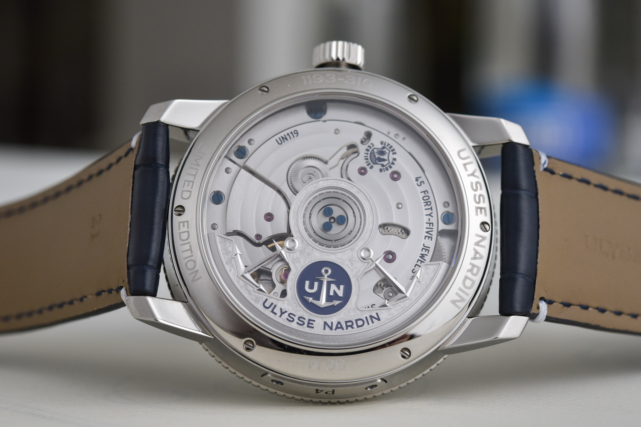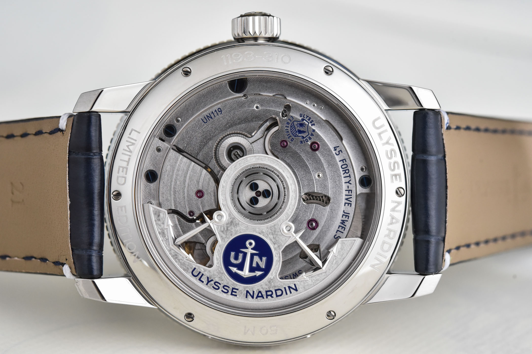 For both models, the stainless case is 42mm wide and 11.13mm thick and features the classic fluted bezel. The movement inside is the UN-119 manufacture movement, which uses a silicon hairspring and a Diamonsil escapement and anchor. Running at a frequency of 28,800 vibrations/hour (or 4Hz), it delivers 60 hours of power reserve when fully wound. The sapphire crystal caseback reveals the winding rotor, decorated with two UN anchors, and elegant decoration with circular Geneva stripes and bevelled edges. And, of course, the movement is a certified COSC chronometer.