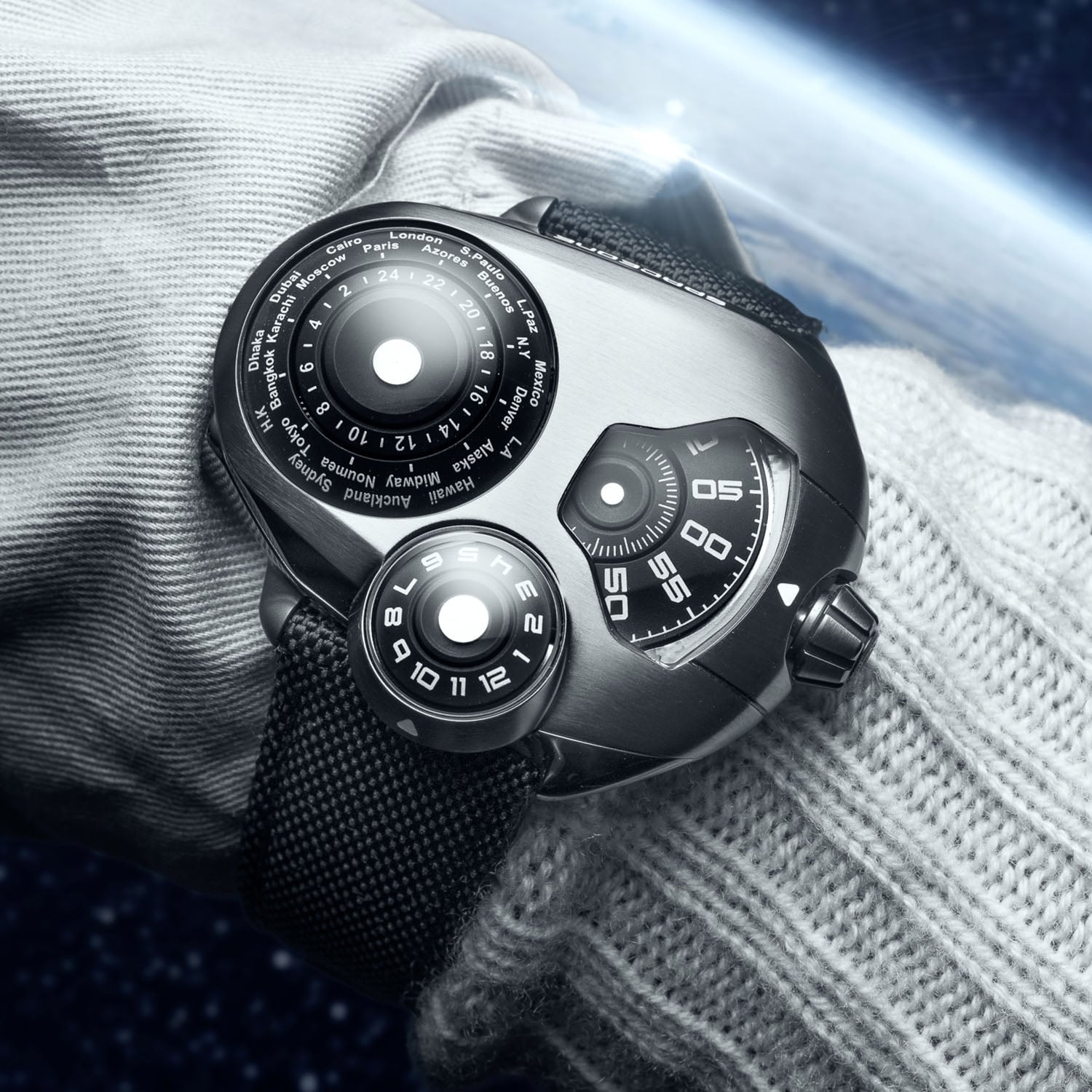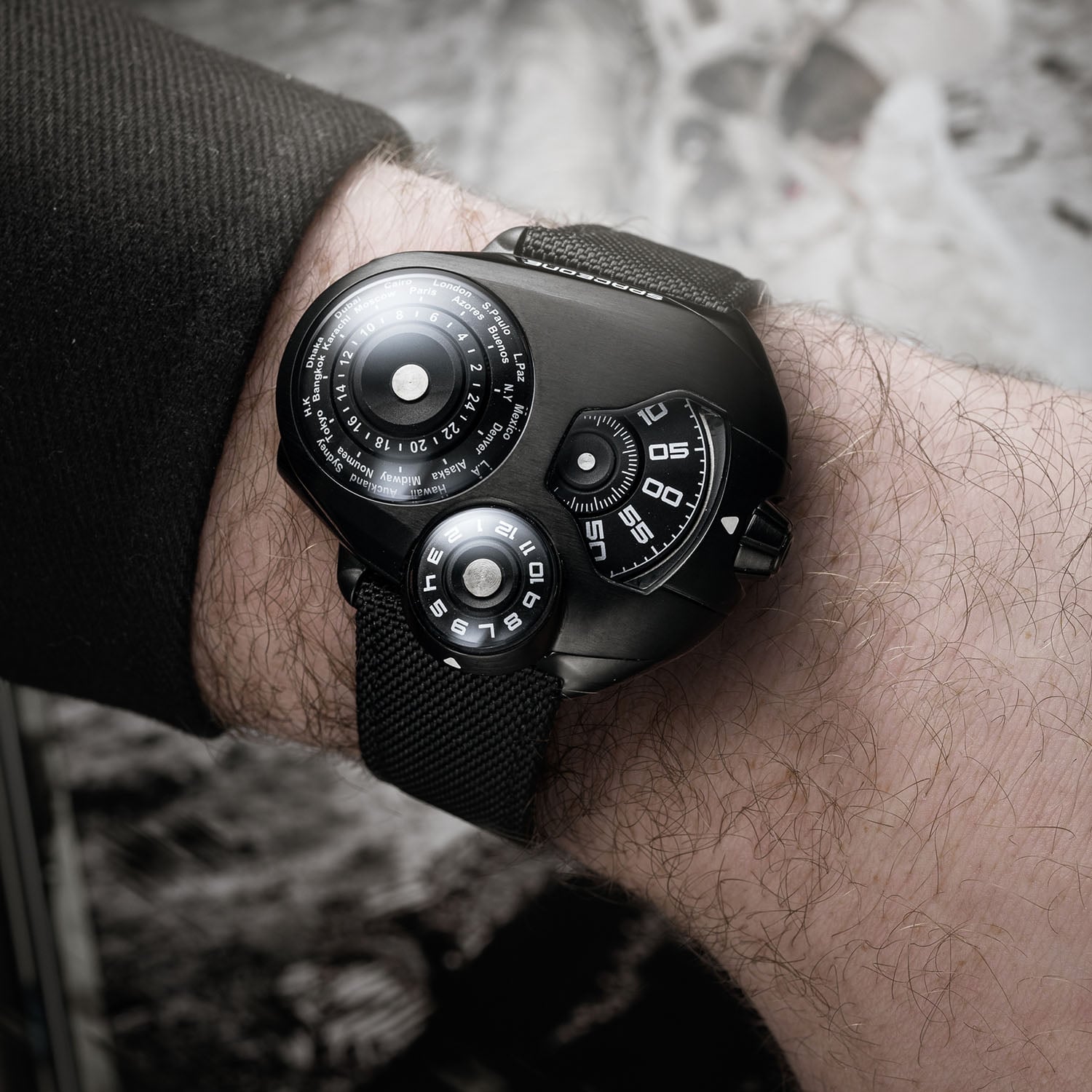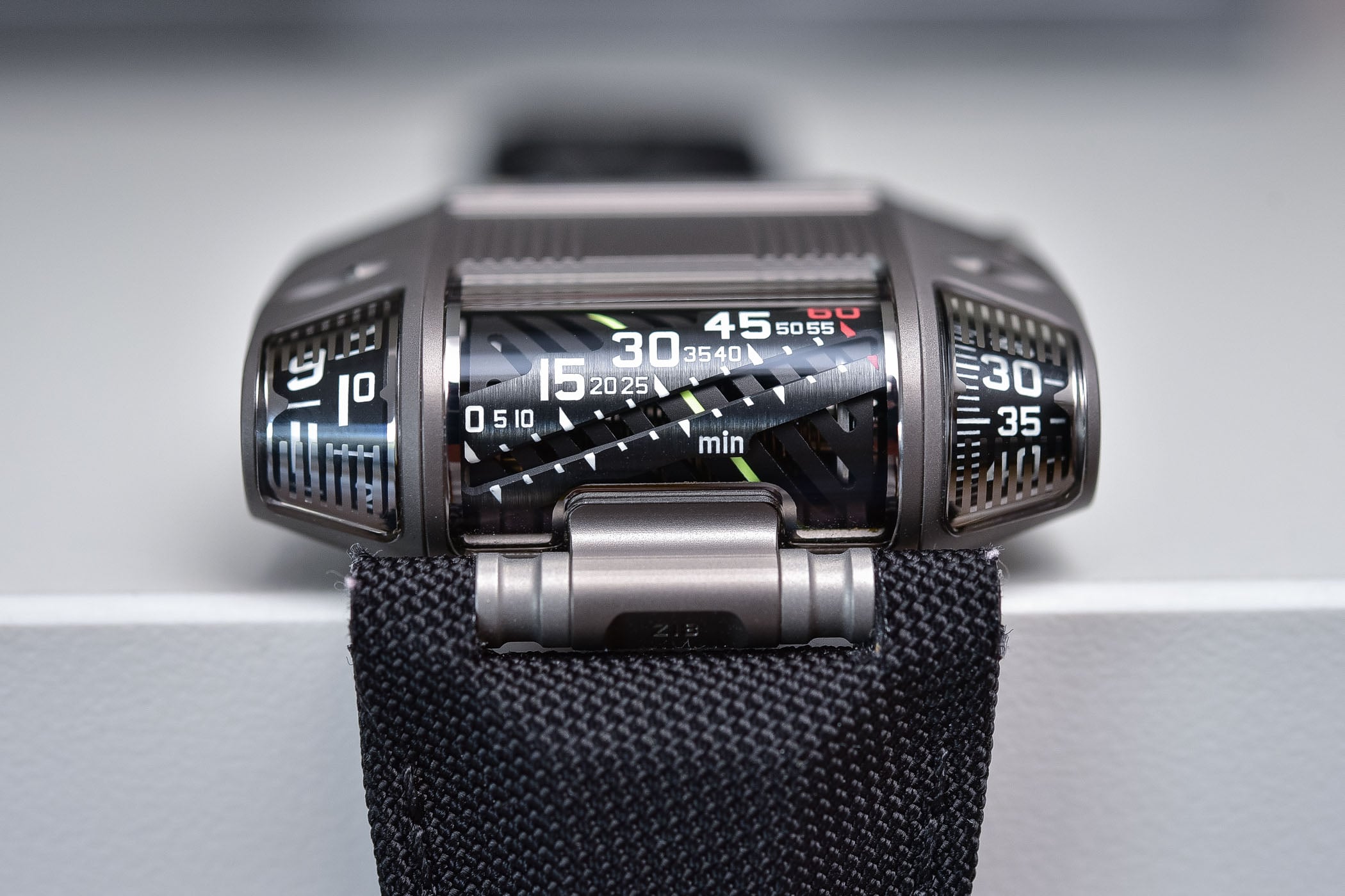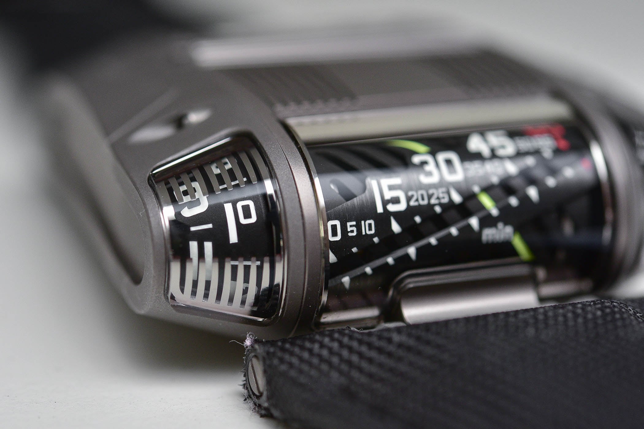As mentioned, URWERK is most associated with wandering hours with incredible, exotic pieces like the UR-100V Magic T. This clearly isn’t your ordinary watchmaker, and some of the wandering hours models push the boundaries of the concept. For example, the UR-150 Blue Scorpion has a minute track that’s a full 240 degrees and each active disc rides under an open-worked blue aluminium “hand” with a neon yellow tip. Once the hand reaches 60 on the track, it snaps back to zero like a retrograde minute hand,d and the carousel of discs rotates 270 degrees to bring the next proper disc under the hand. It’s the same wandering hours concept, but with a complex and futuristic execution. Some models use rotating “cubes” instead of discs, like the UR-230 Eagle. In this particular model, half of the display is covered by the case, showing only the relevant time-telling elements at the bottom (hour numeral via a cube under an open-worked hand at the bottom of the minute track). The UR-230 Polaris has the same design as “wandering cubes” but with a completely open display.