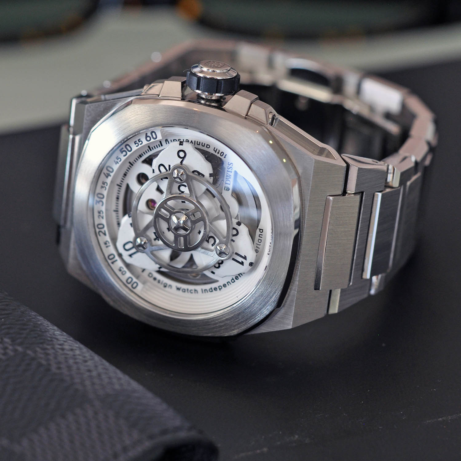 The top back of the watch has a large sapphire crystal (with four steps) displaying what appears to be the engine of a Ferrari V12 (valve covers and all), as the pair of designers are also huge car enthusiasts (the rear crowns again resembled wheels). Production was limited to 99 pieces (all were quickly spoken for) and is horological art first, timepiece second. Some car enthusiasts drive their Ferraris daily (as they should), but most reserve them for weekends and/or special occasions. This watch definitely meets that ethos. You certainly can wear it daily, despite its size and somewhat awkward proportions, but I assume most buyers will treat it more as a piece for special occasions.