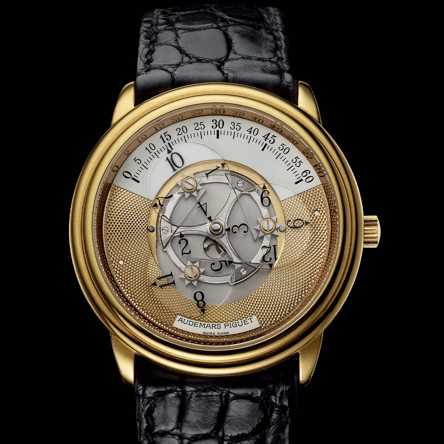 Wandering hours show the time via rotating discs with Arabic numerals on each. The most common (and traditional) setup has three individual discs with four numerals per disc and an arched minute track at the top or bottom. A disc will rotate to the correct hour when it reaches the minute track and remain as it glides over the track for 60 minutes, pointing to the correct minute as it goes. After 60 minutes, the next disc with the correct hour starts at the beginning of the track and so on. Many setups like this have a central seconds hand as well, like the current Audemars Piguet Code 11.59 Starwheel. Some modern displays have only two discs with six numbers per disc, as in India’s first wandering hours watch, the Titan Stellar 3.0. The concept is the same with a 180-degree minute track at the top, allowing one disc to enter the track as the other leaves.