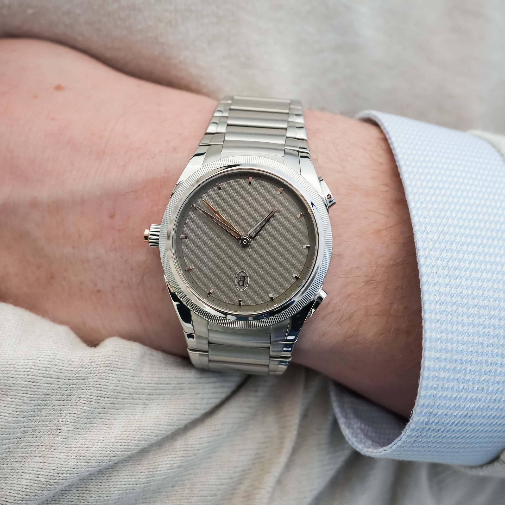 For this edition, the dial retains the style of either the micro-rotor or GMT models, but in a new and appealing Sand Grey colour. This soft, warm and discreet grey tone is here paired with the signature ultra-fine hand-guilloche Grain d’Orge texture of the collection – a deliberately miniaturized pattern that only reveals its true nature when looked closely, and appears almost matte at a distance. The small touches of rose gold, on the minute hand and the crown-integrated pusher, add a discreet sense of luxury. The bracelet, following the lines and finishes of the case, wears like a charm but can’t be easily removed or micro-adjusted.