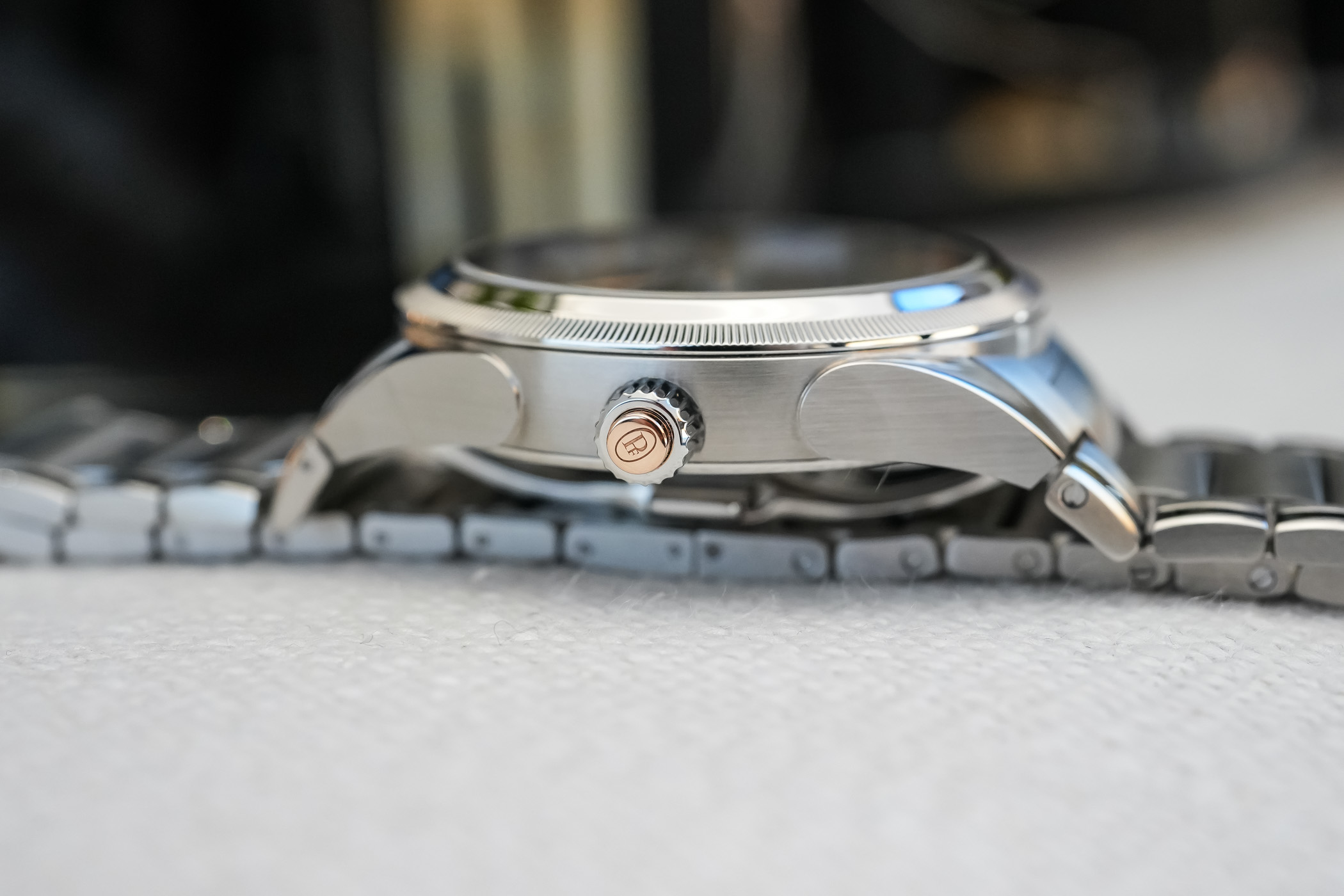 The case, made of stainless steel, measures 40mm in diameter, with a height of 10.7mm – about 3mm more than the time-only micro-rotor version (explained by the more complex movement and superimposed minute hands). Yet, it remains a relatively compact watch that wears nicely thanks to its soft tonneau shape, and sloping bracelet. The case, decorated with a combination of satin-finished and polished surfaces, is not only elegantly shaped but also finely executed, with an impressive level of detail. Two elements particularly caught my attention; the finely knurled bezel made of 950 platinum (used here for its incomparable sheen) and the gorgeous drop-shaped pushers on the left side, which are not only beautifully integrated but also extremely satisfying to use. The case has sapphire crystals on both sides and a respectable water-resistance of 60 metres.