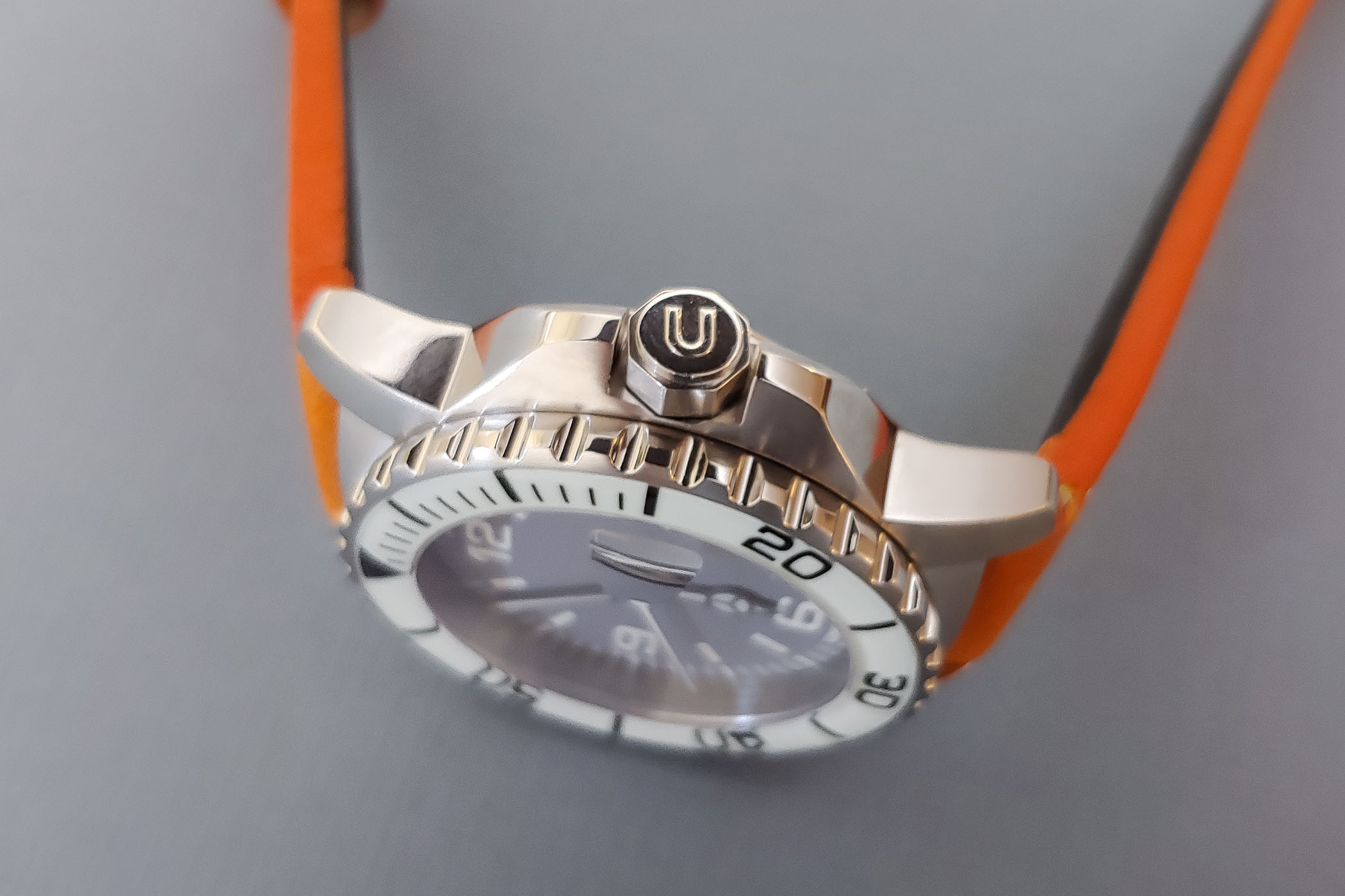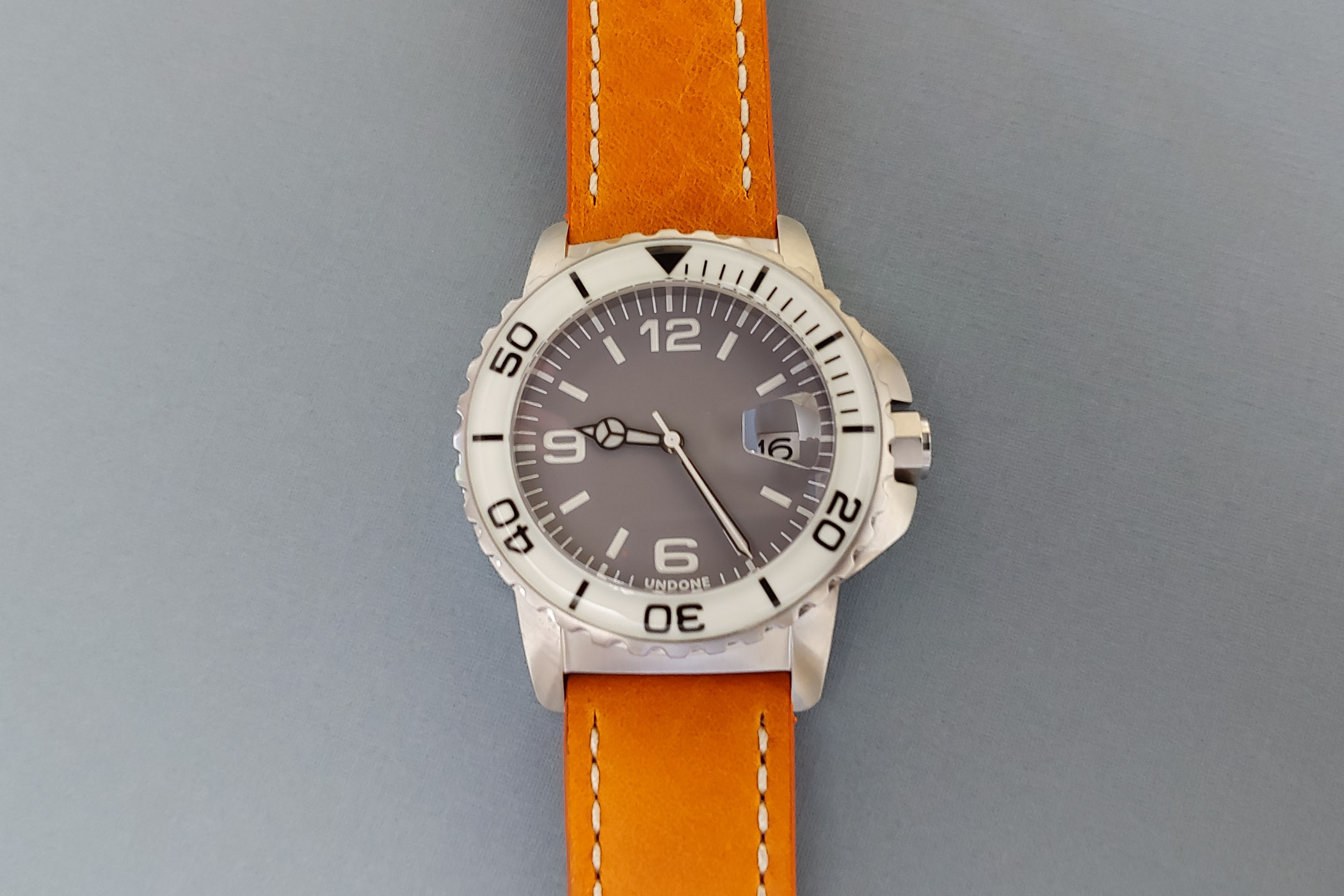 The strap on mine is a calf-orange Italian leather with cream stitching. It has a brushed stainless steel buckle with UNDONE’s name and logo stamped. The lug width is 22mm and the strap has quick release levers that are always appreciated.