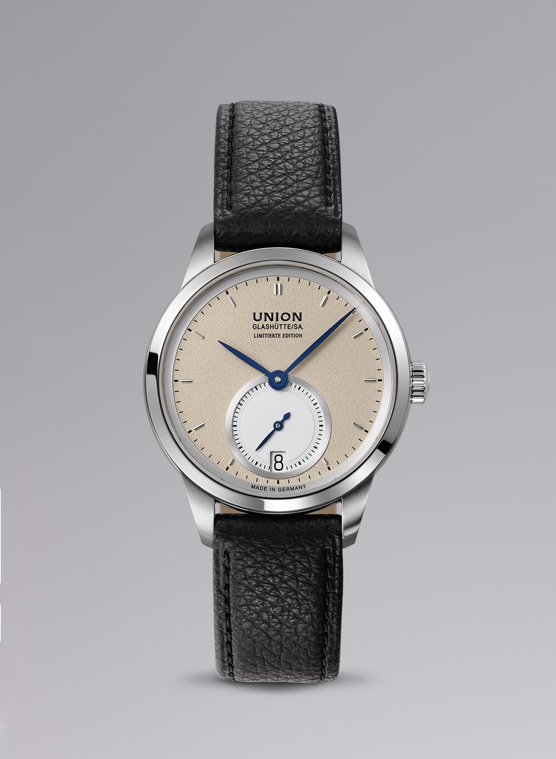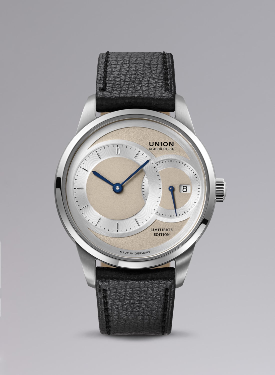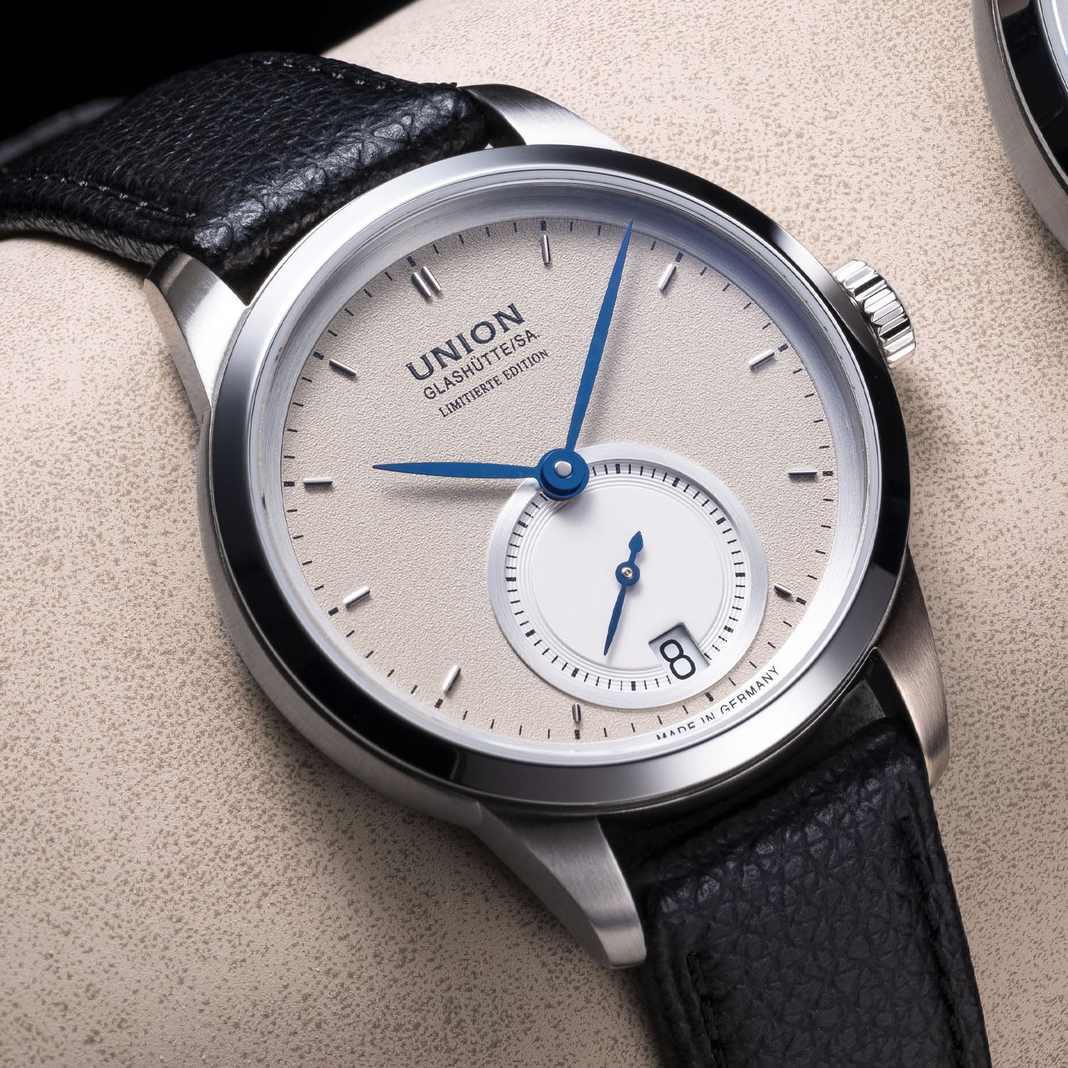 The models are housed in 316L stainless steel cases with softly rounded contours and domed sapphire crystals, with an anti-reflective coating on both sides. The Large Second measures 41mm across and 11.8mm thick, is 100m water-resistant, while the Small Second offers a refined 34mm by 9.6mm profile and is water-resistant to 50m. Each features a sapphire caseback, revealing the automatic Union calibres within, movements derived from the ETA 2899 and ETA 2895-2 architectures, respectively. Both provide a 42-hour power reserve, a stop-seconds mechanism, and a date display, with decorative Glashütte-style finishing including perlage, blued screws, and striping.