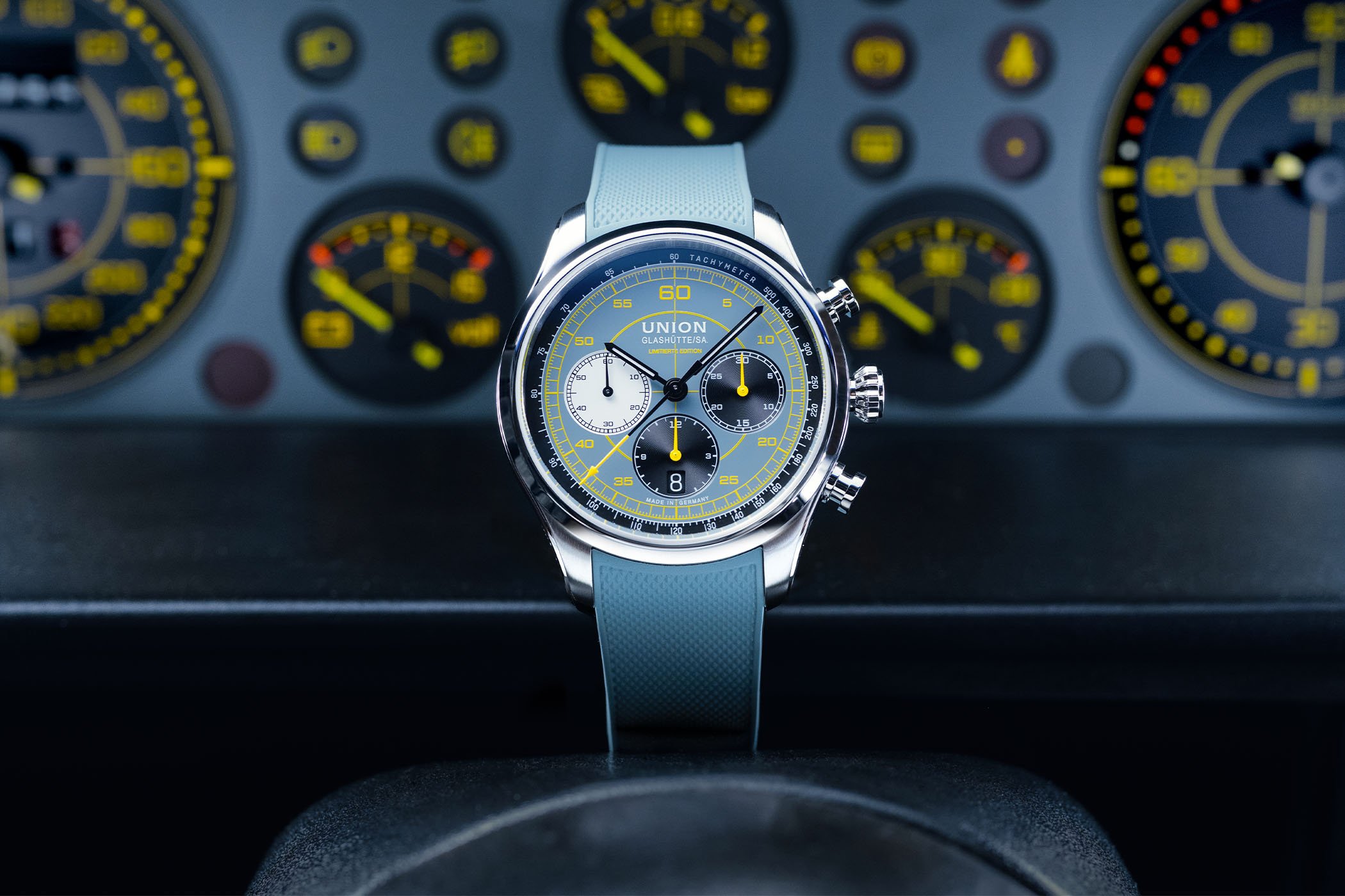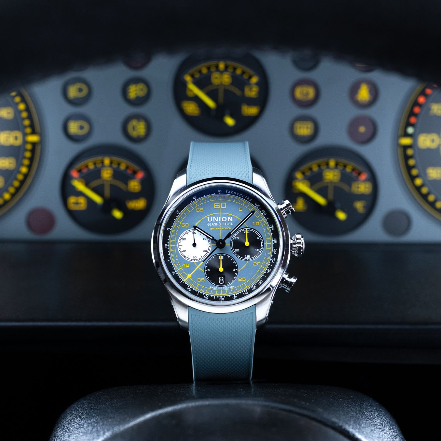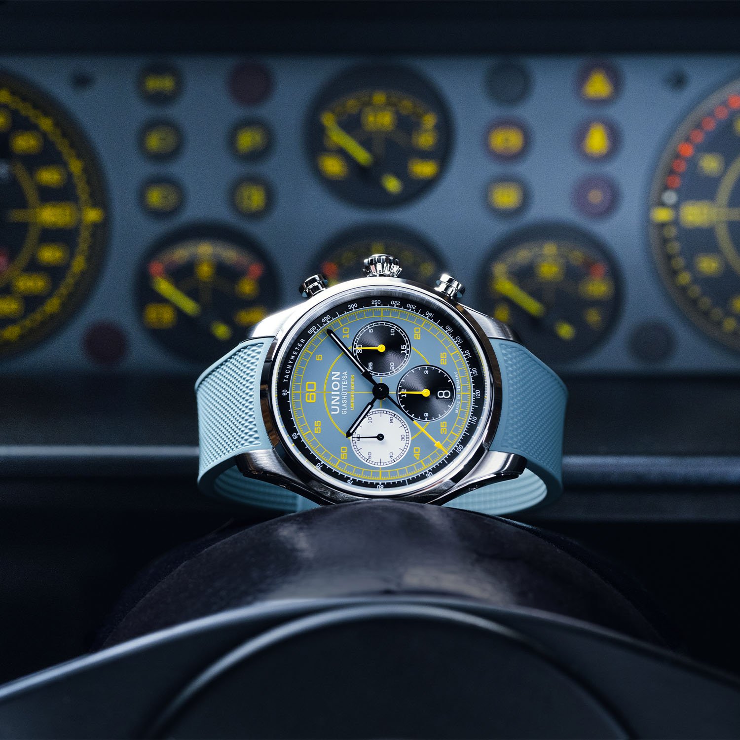 Italian cockpit design meets Saxon chronometry in a bold, blue-grey and yellow limited edition.