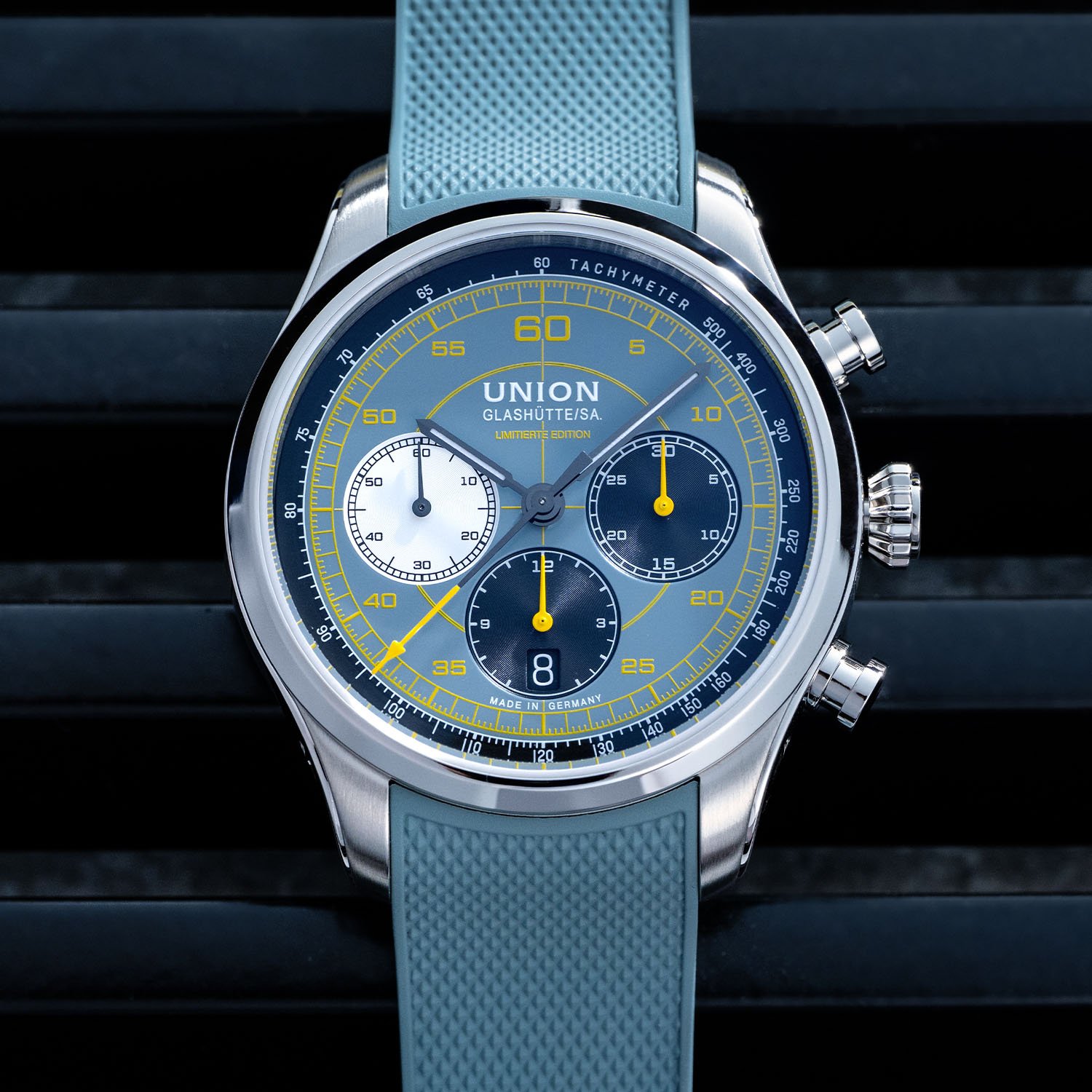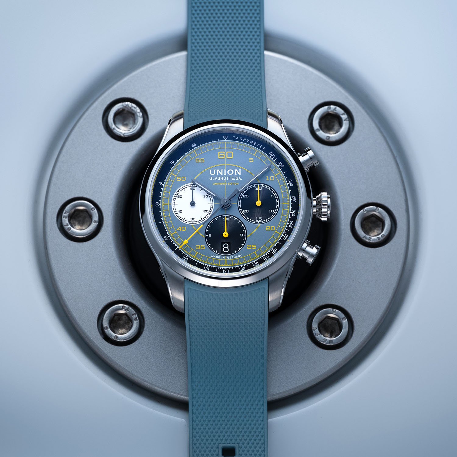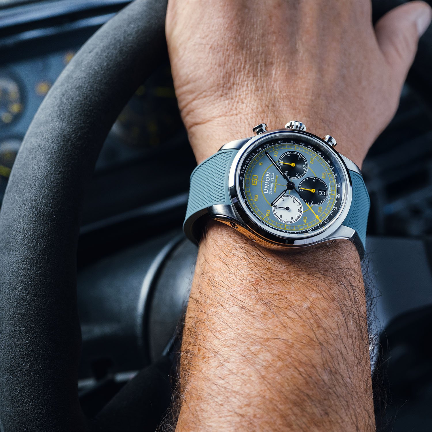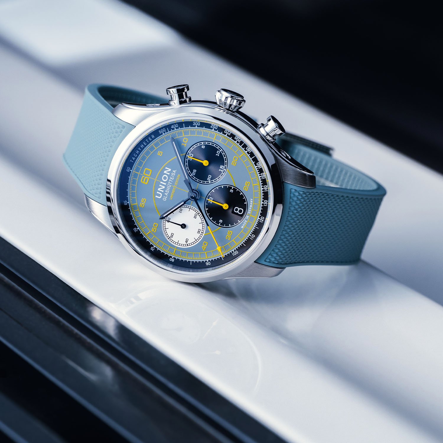 Italian cockpit design meets Saxon chronometry in a bold, blue-grey and yellow limited edition.