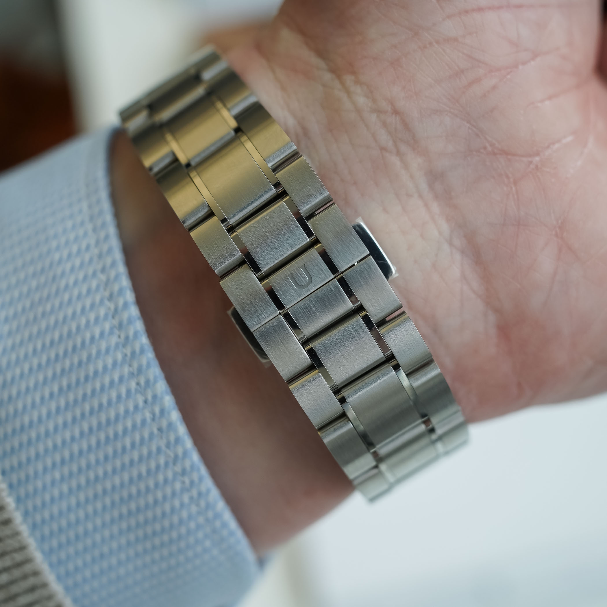 It’s essential to note that rapid date correction (via a corrector conveniently located on the side of the case at 10 o’clock) should be avoided between 8:30 p.m. and 11:30 p.m. The stop-second feature enables precise time-setting, while the chronograph pushers offer the right resistance for a satisfying response. With a water resistance of 100 meters, the watch instils extra confidence, and the stainless steel bracelet ensures the safe position on the wrist closed with a double-fold fastener with twin push-buttons, also equipped with quick change spring bars, should you wish to opt for an interchangeable black textured rubber strap.