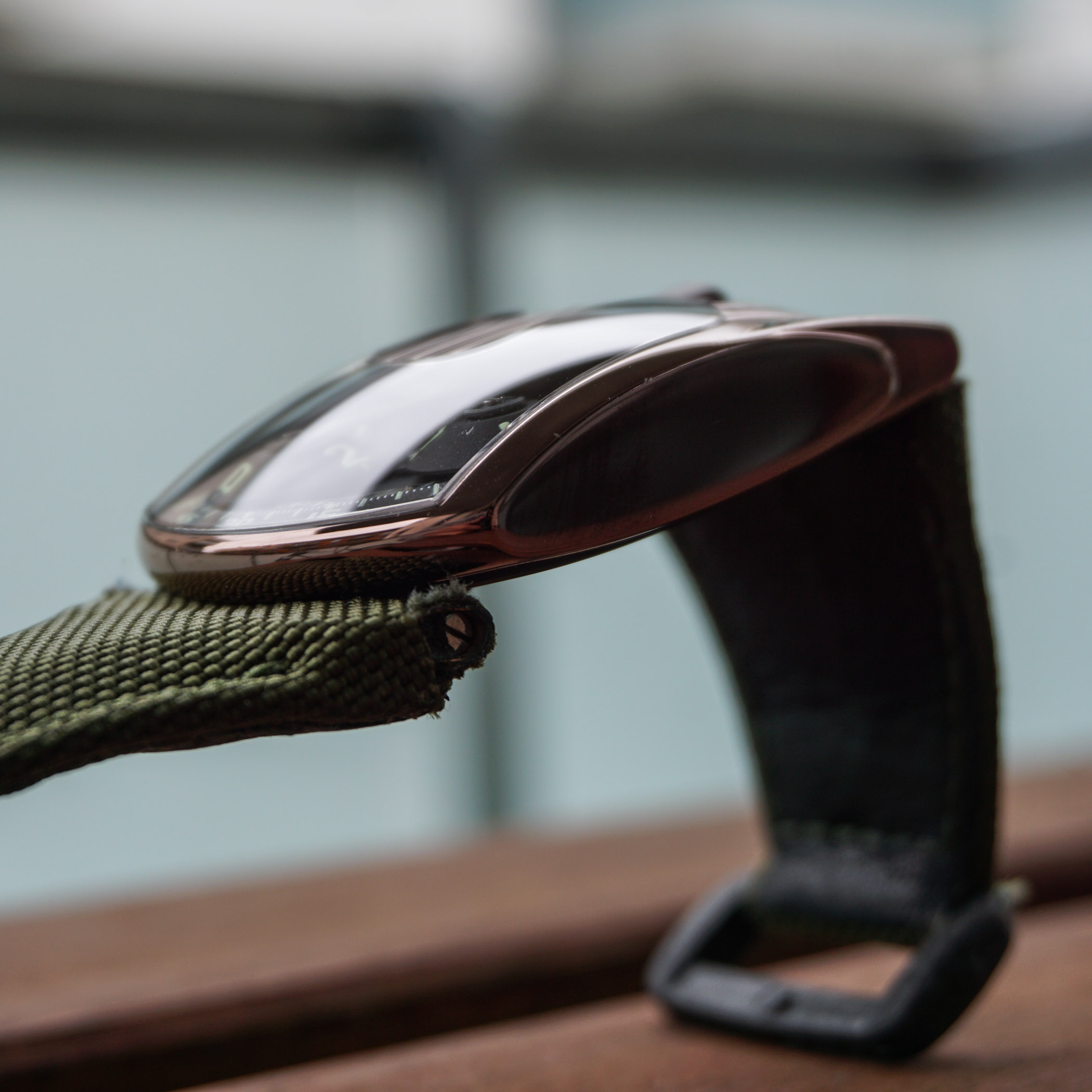 So what is the watch like on the wrist? The UR-103.08 has an unconventional shape, so best to break down the measurements. The width from 3 o’clock to 9 o’clock is the most straightforward, at 36mm. At its longest, the case measures 49mm, though, since the crown sits inboard of the outermost outcropping of the lugs, the watch does not look it. Where it gets really difficult is the thickness, so I’ll give you three measurements: at where 6 o’clock would traditionally be (6mm), in the middle of the case (14mm), and at where 12 o’clock would traditionally be (13mm).