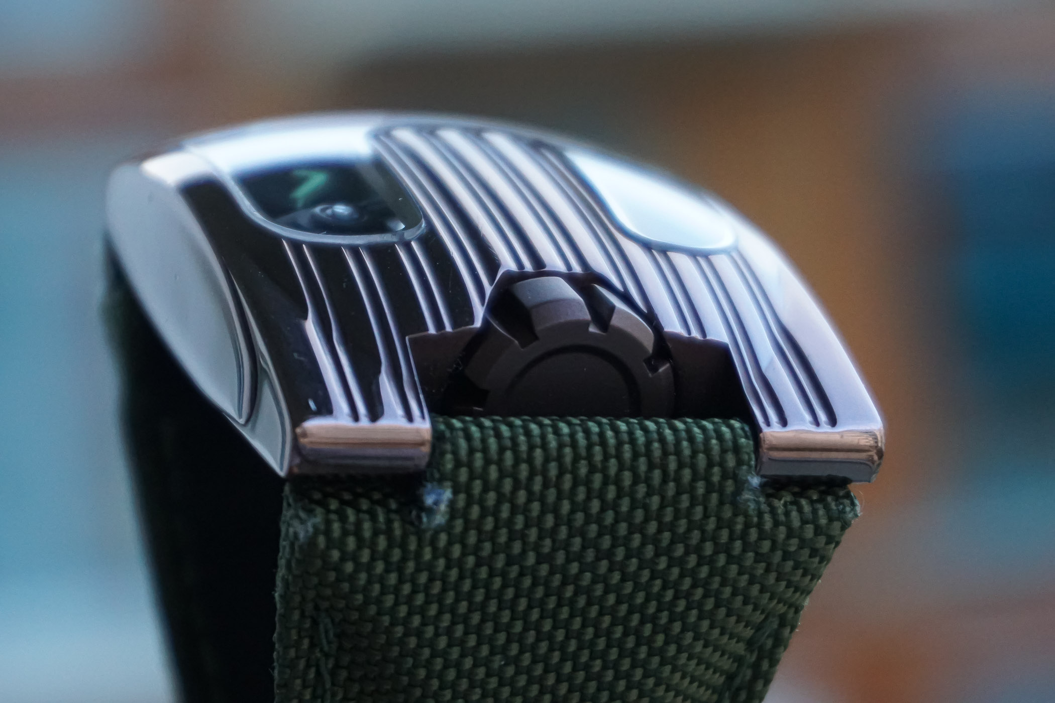 The UR-103.08 features a “standard” 103 Targa case with a curved sapphire crystal. The 103.08 marks a happy middle ground between the early 103.03, which had 12 sets of engraved grooves, and the 103.05, which only had 6. The 10 sets of grooves create visual interest while leaving a smooth, polished border that frames the time display. To me, this is a small touch that adds so much to the design – that little extra bit of smooth, curved and polished metal echoes the swooping shape of a 1930s sports car. The 103.08 case is made out of stainless steel, which also marks a first for a series-production variant in the model family. On top of the steel, URWERK then applies a coating of TiAlN (Titanium Aluminum Nitride), which not only makes the watch extremely resistant to scratches but also lends a warm purple-brown hue.