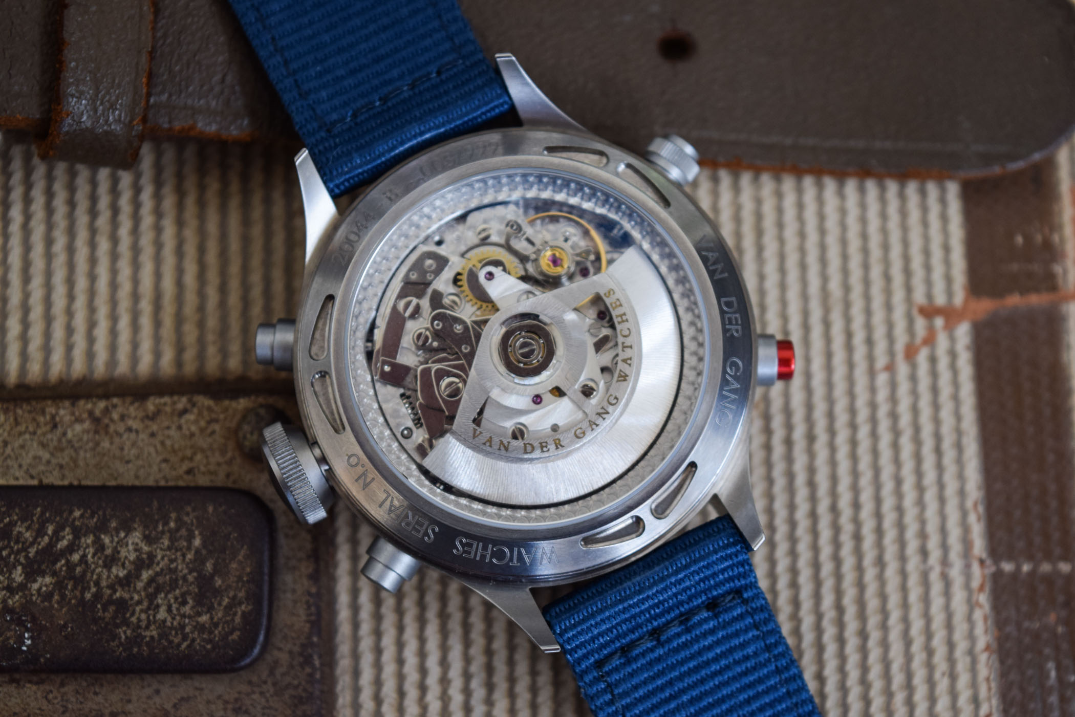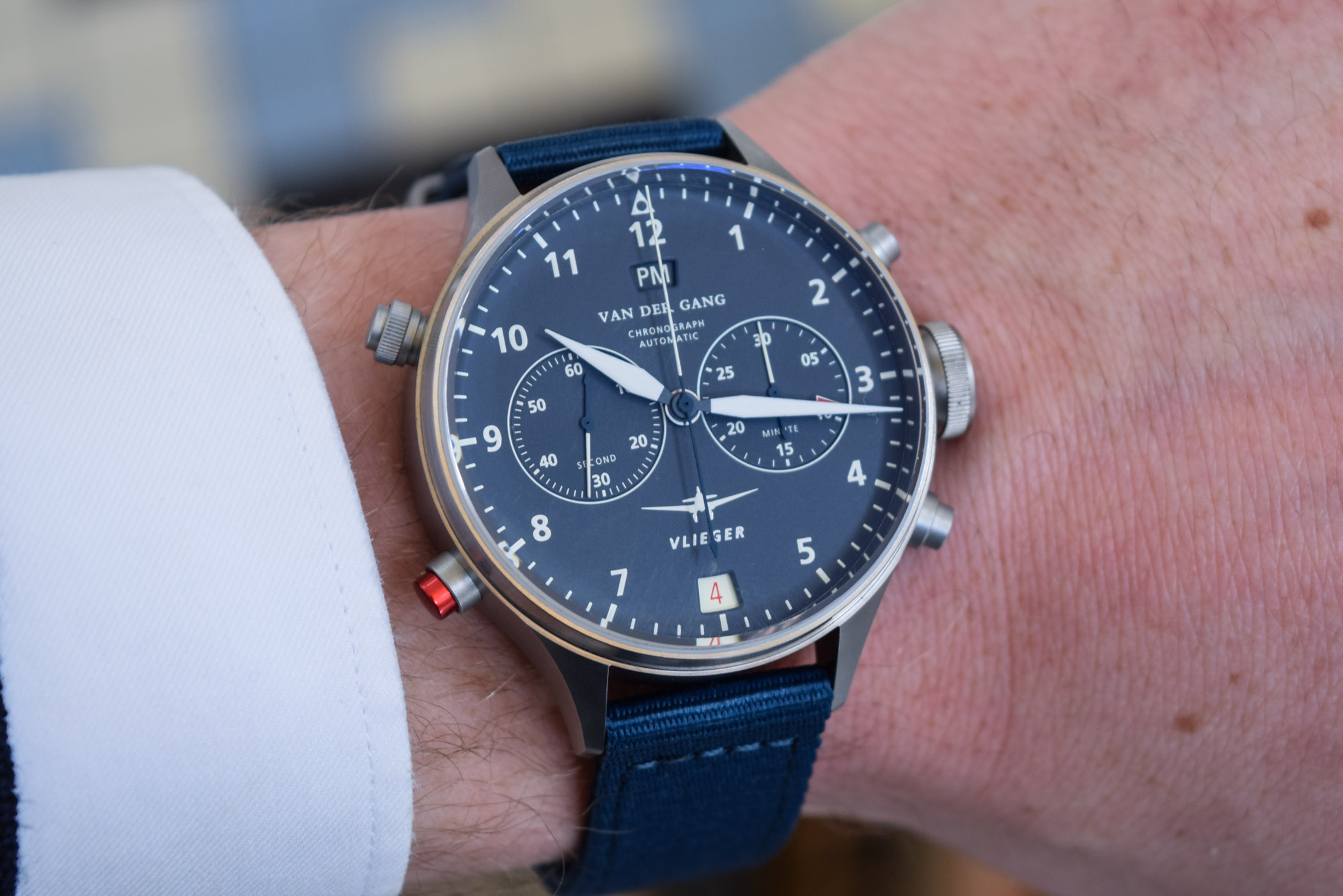 Van der Gang organised the event to showcase its Vlieger collection. The Vlieger was introduced five years ago and comes in two sizes (41mm and 44mm) and in various different colours and finishes, strap options, etc. All feature a Valjoux 7751 chronograph movement that has been converted (in-house) to a bi-compax layout. A 12-hour GMT indication, AM/PM indicator and the date at 6 o’clock are adjusted with the pushers on the left, with the red pusher at 8 o’clock linked to the red GMT hand.