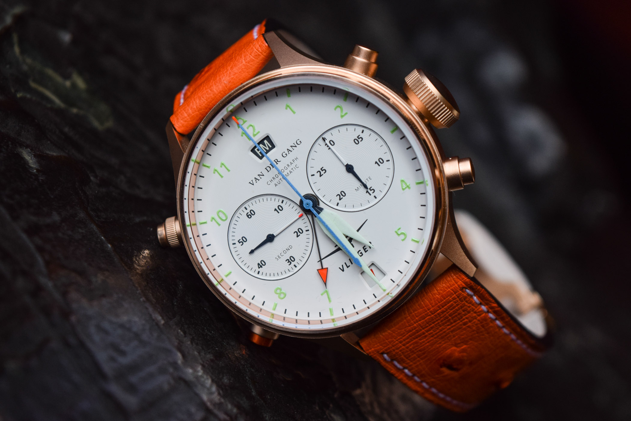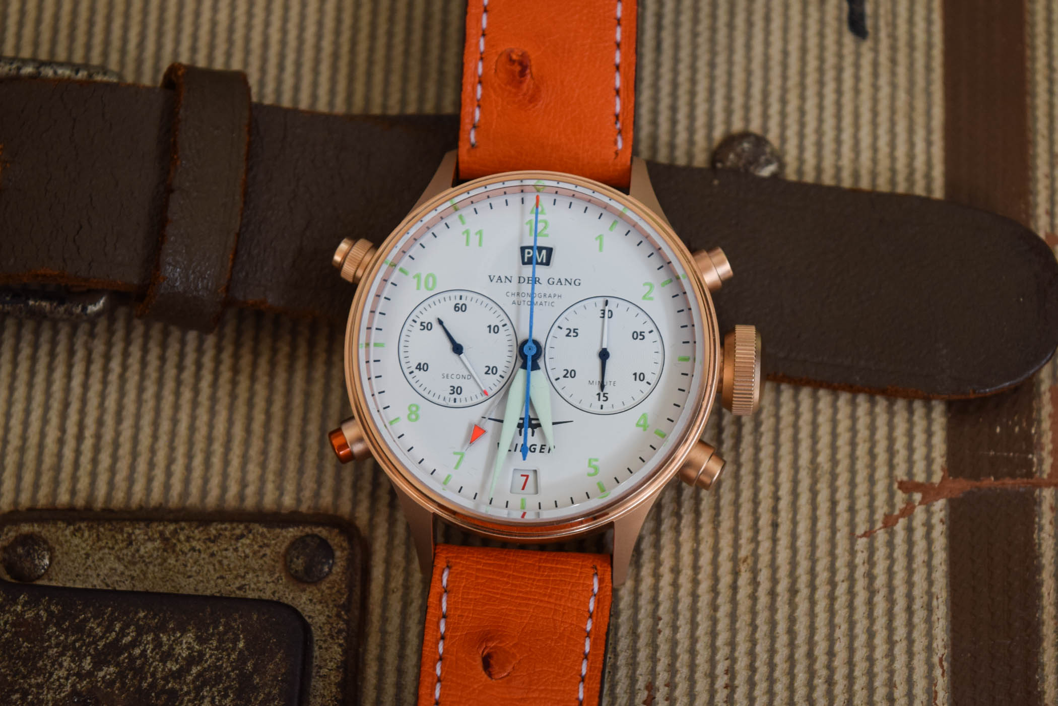 The rose gold Van der Gang Vlieger Satiné comes in a 41mm diameter with a matte white dial. The case is satin-finished by hand with a beautiful result. It is matched with a bright orange leather strap with a folding buckle in gold. The GMT pusher at 8 o’clock is orange to match the overall theme of the watch.
