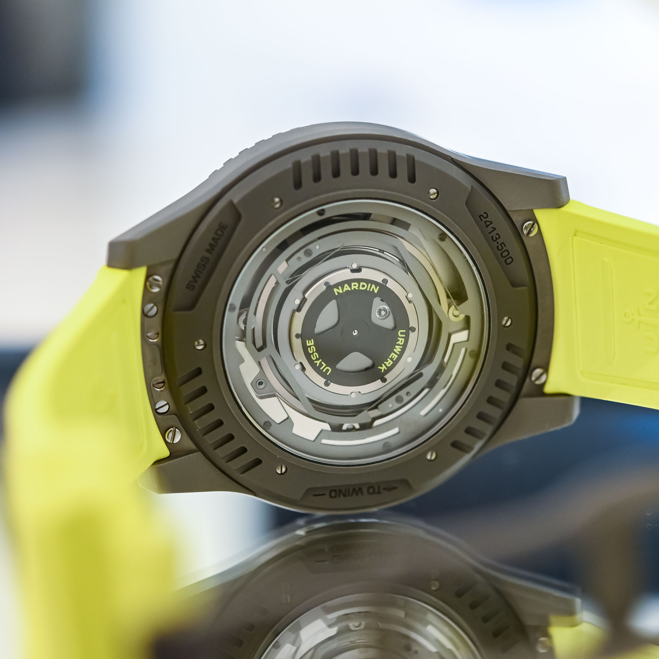 In keeping with the Freak’s founding principle, the UR-FREAK has no crown. Time is set via the rotating bezel, secured by a small locking tab at six o’clock marked UR-FREAK. When released, the bezel engages directly with the minute satellite, allowing precise, tactile adjustment. Winding is handled through the rotating caseback, another ergonomic hallmark of both collaborating brands. Despite its dynamic construction (moving parts), the case still provides 30m of water resistance.