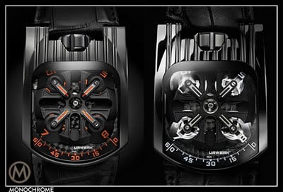 In april i blogged about the new Urwerk 103T Tarantula, so i won’t go to deep into the specifics. The two previous models where in stainless steel and white gold. The stainless steel treated with AlTiN (Aluminium, Titanium, Nitride) has a matte black. The white gold version is polished, giving the watch a shiny and chic look.