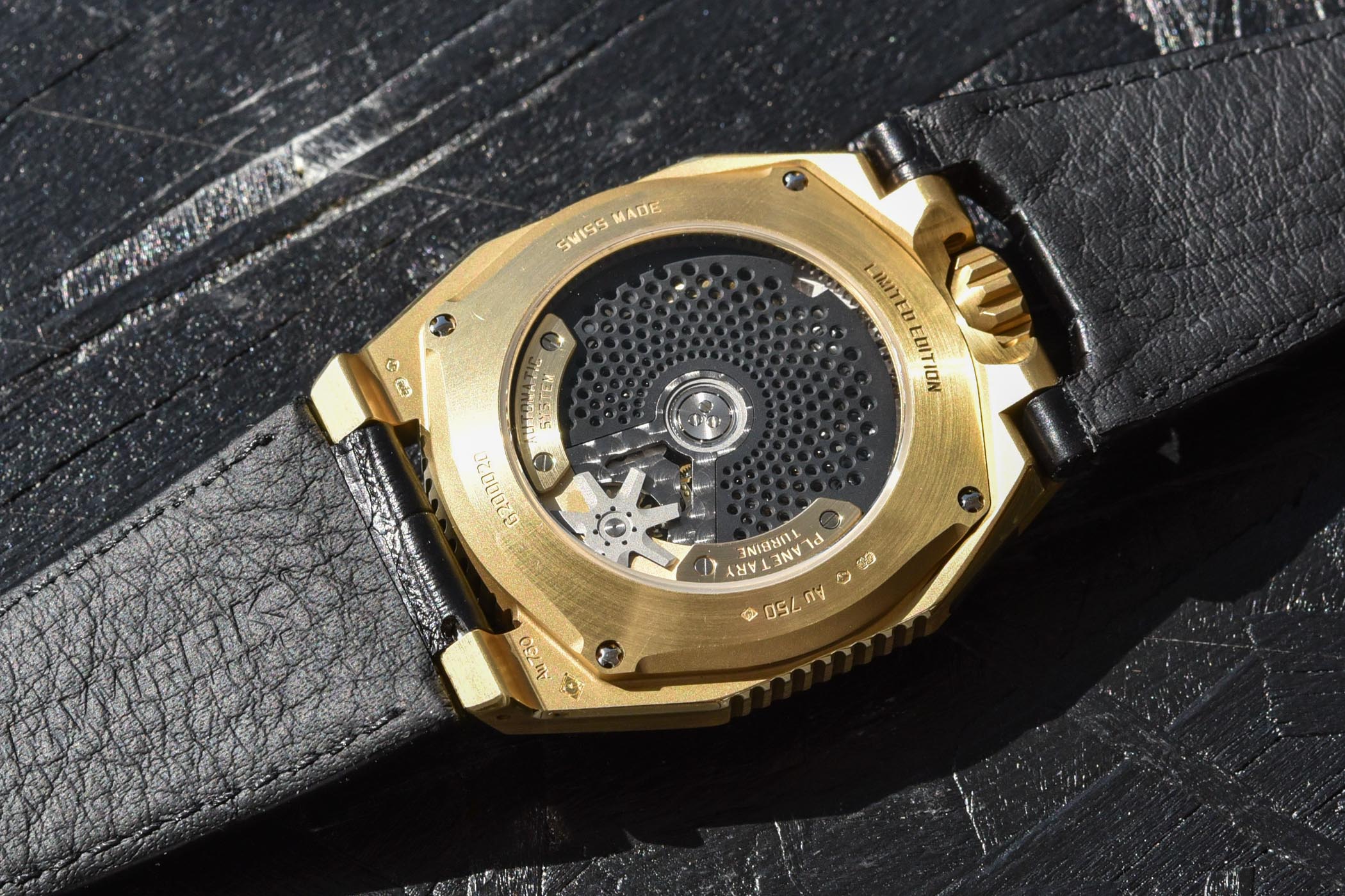 The UR12.01 calibre still displays hours via revolving satellites and minutes via a curved track on the bottom with a retrograde hand following the hour satellite. On the left and right sides of the display, you still find the Earth’s rotational and orbital distances travelled over 20 minutes. Not something you’d need daily, but it ups the cool factor quite a bit. The backside of the watch reveals the drilled full rotor with a planetary flat turbine to reduce shocks to the bearing and reduce wear.