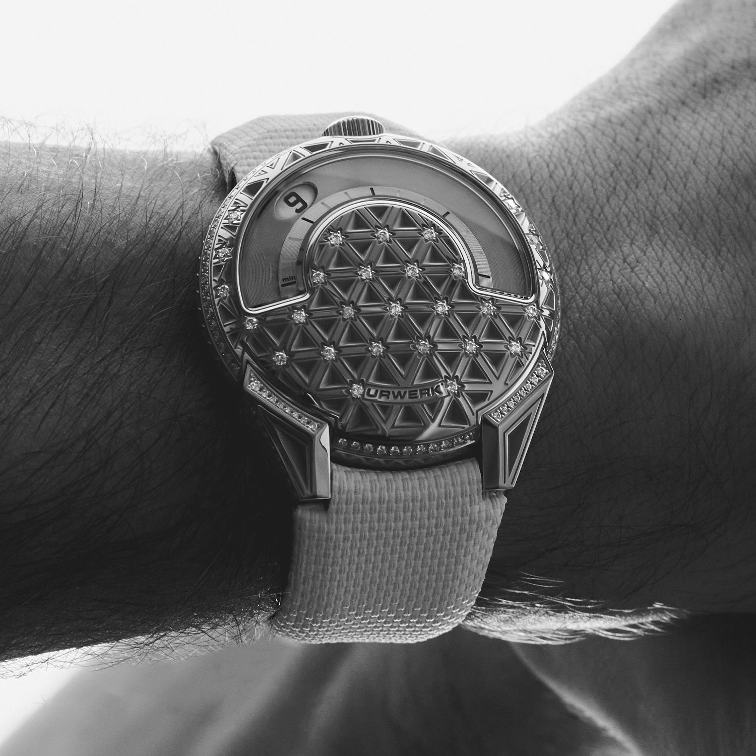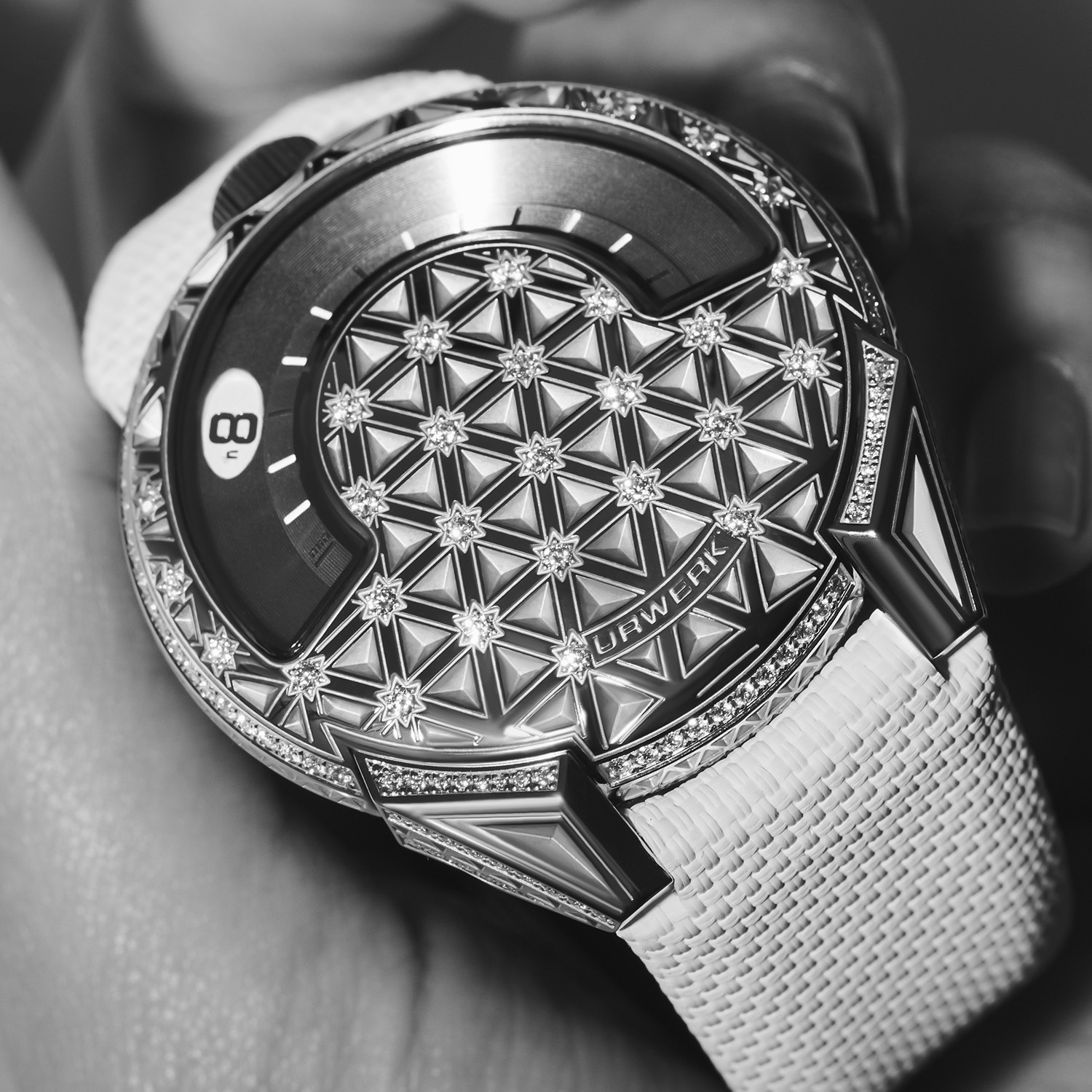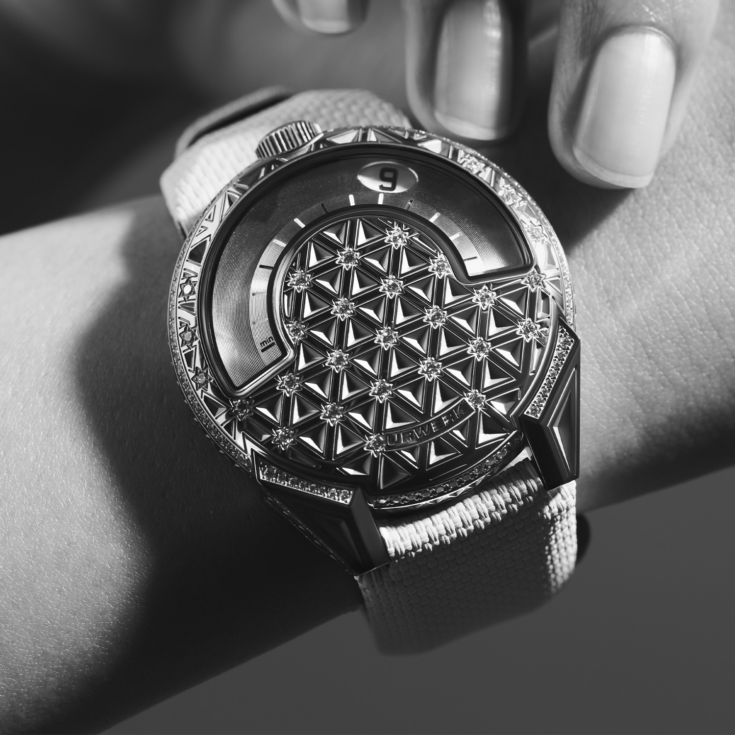 This latest UR-101 version retains the modern UR-101’s relatively compact, curved architecture, with a 41mm diameter and a slim 9.33mm profile. The case remains instantly recognisable, with its crown now at 12 o’clock (the original had it at 3 o’clock) and featuring a puller on the back for ease of use, short integrated lugs, and a domed profile. The steel case is engraved with a geometric network, into which 214 responsibly sourced diamonds (totalling 1.63 carats) are set, forming a constellation-like pattern. Water resistance is 30m.