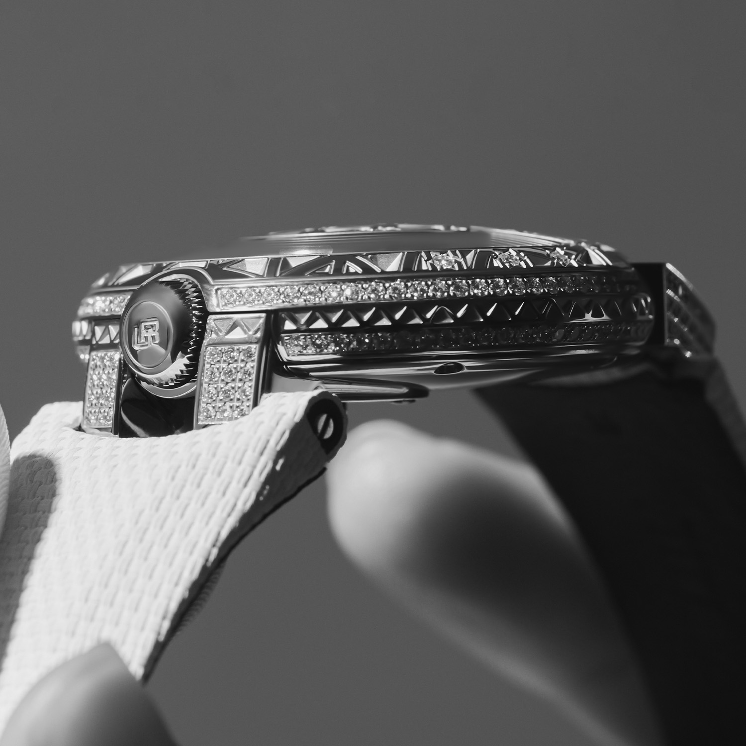 The UR-101 Diamond Sky is worn on a white textured rubber strap with a black calfskin lining, closed with a steel pin buckle. Limited to 25 pieces, it represents a rare exploration of jewellery within Urwerk’s typically technical universe. Price is CHF 85,000 (excl. taxes). For more details, please visit www.urwerk.com.