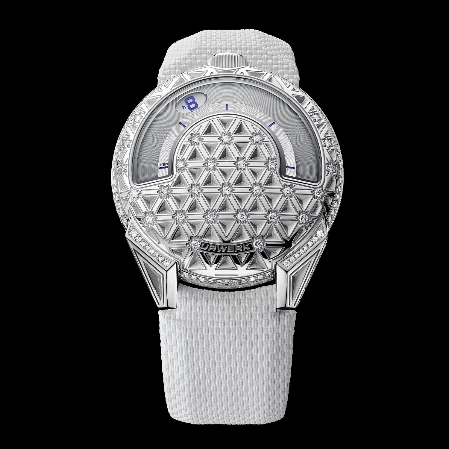 The UR-101 Diamond Sky is worn on a white textured rubber strap with a black calfskin lining, closed with a steel pin buckle. Limited to 25 pieces, it represents a rare exploration of jewellery within Urwerk’s typically technical universe. Price is CHF 85,000 (excl. taxes). For more details, please visit www.urwerk.com.