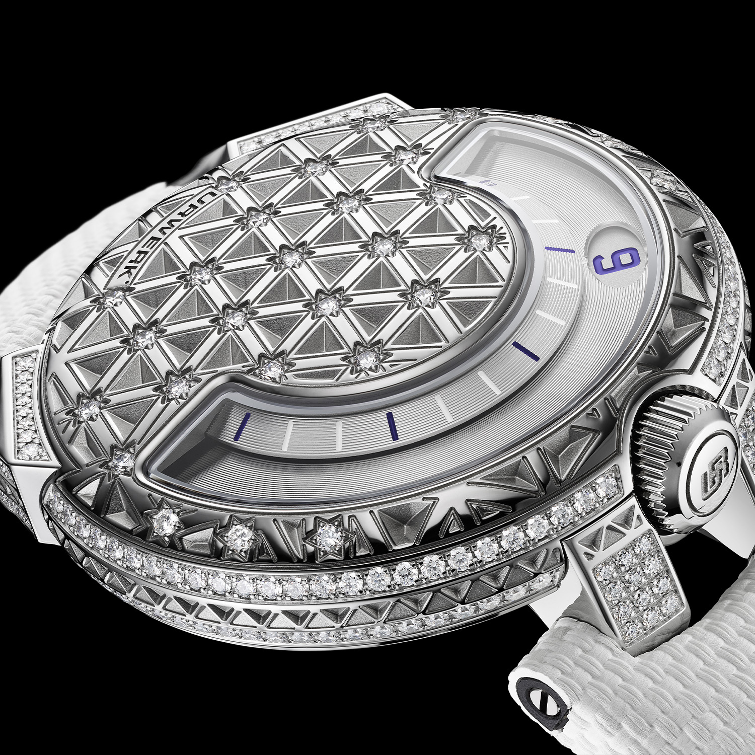 This latest UR-101 version retains the modern UR-101’s relatively compact, curved architecture, with a 41mm diameter and a slim 9.33mm profile. The case remains instantly recognisable, with its crown now at 12 o’clock (the original had it at 3 o’clock) and featuring a puller on the back for ease of use, short integrated lugs, and a domed profile. The steel case is engraved with a geometric network, into which 214 responsibly sourced diamonds (totalling 1.63 carats) are set, forming a constellation-like pattern. Water resistance is 30m.