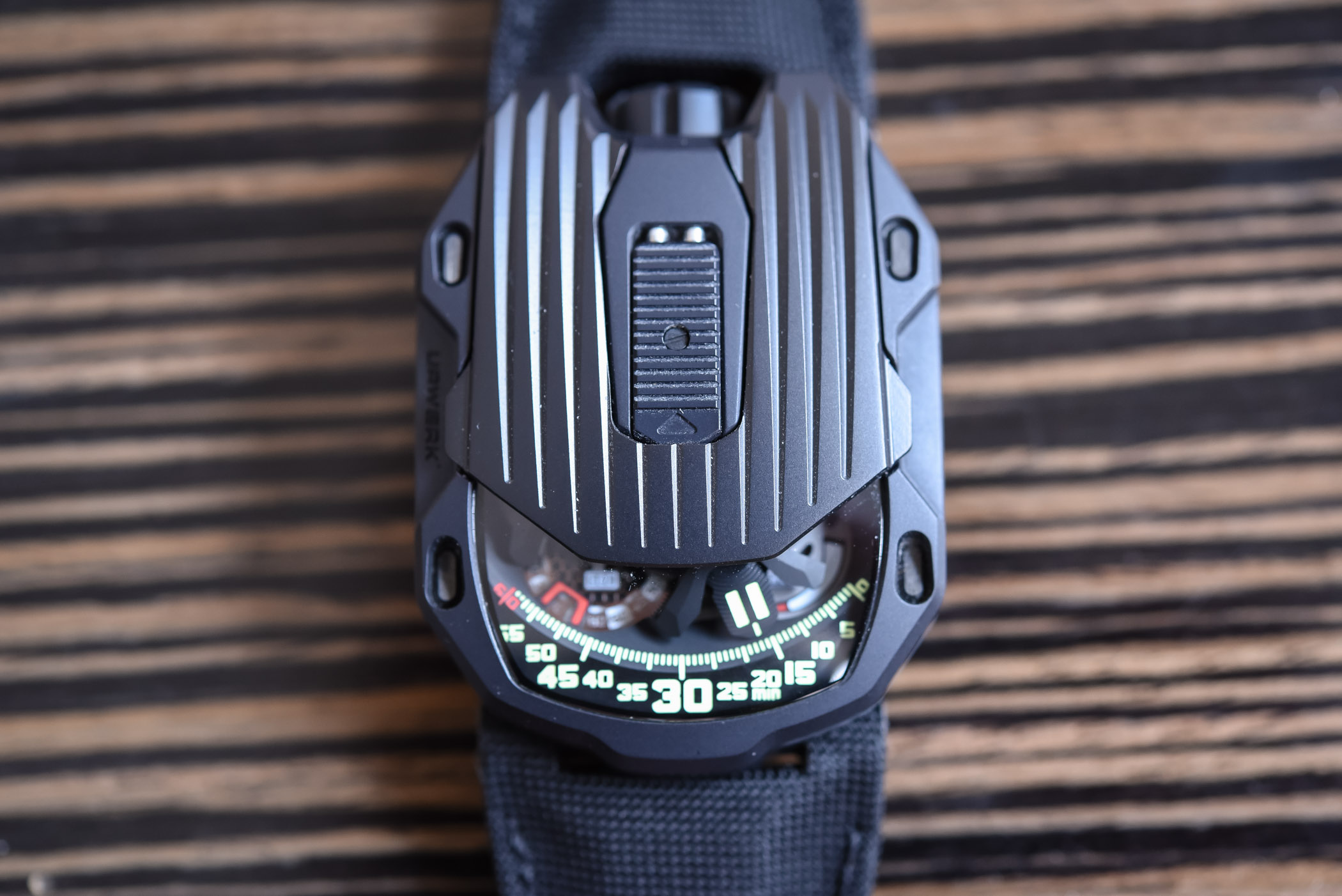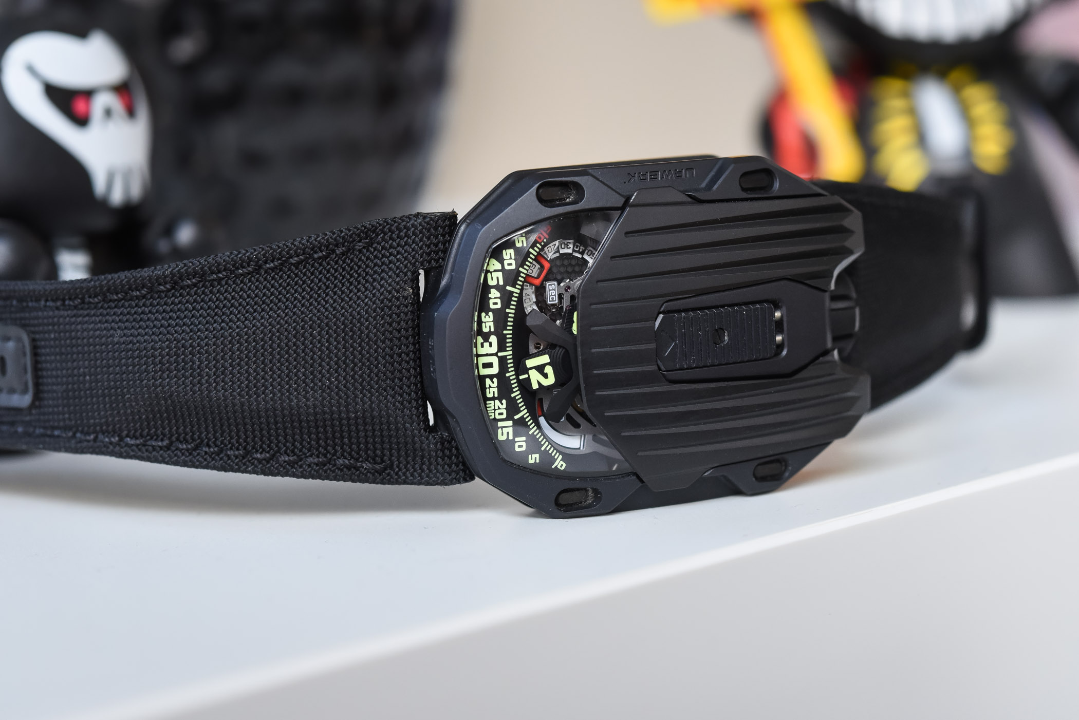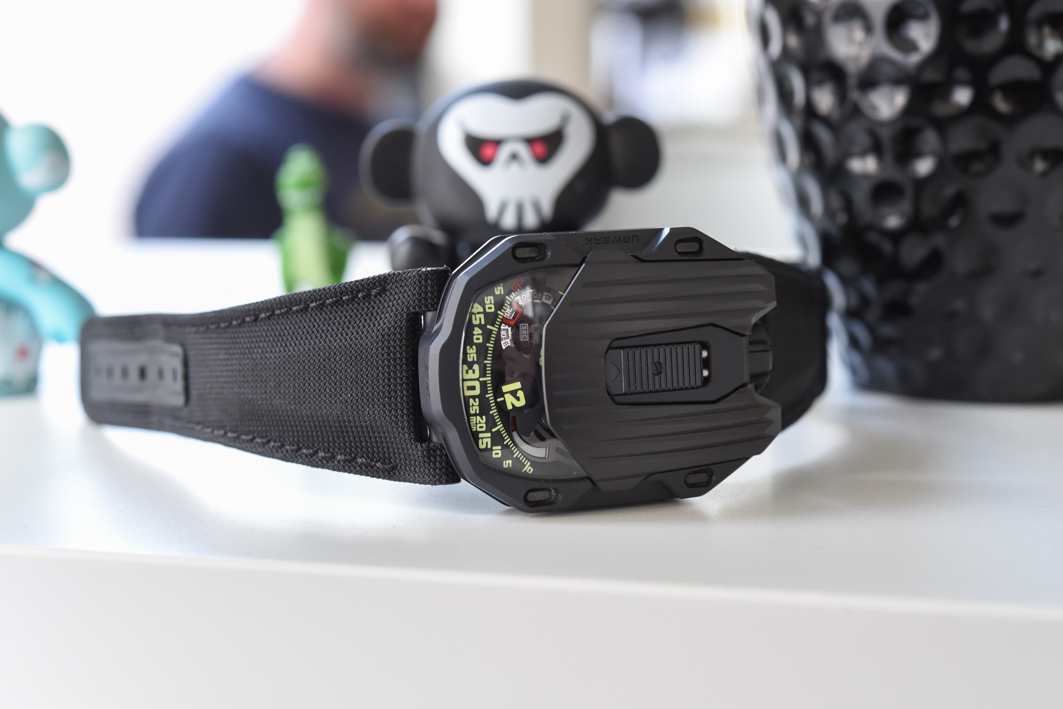 Launched to coincide with Urwerk’s twentieth anniversary in 2017, the UR-105 CT Streamliner is a celebration of the city that put the wind in Urwerk’s sails: New York. Three versions of the UR-105 CT are in circulation today, each one designed to capture a New York minute. According to co-founder and designer Martin Frei, the titanium and polished steel model is “like New York City in broad daylight, bright and shiny” while the Kryptonite model evokes a Gotham City atmosphere emitting its green lume in the dark. The most stealth interpretation of the three Streamliners is this titanium and black PVD-coated steel version, something the Dark Knight might have worn on his vigilante crusade to eradicate evil from Gotham City, New York’s fictional alter-ego in Batman movies and comics.