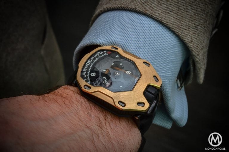 Important facts: every URWERK is a masterpiece of ultra light materials, with ultra smooth surfaces. Like every mechanical watch, every URWERK has a main spring that holds all energy that will be steadily released by the escapement. This makes the hands turn in a precisely adjusted speed so they indicate the time correctly. Normal hands are MUCH lighter than the satellite complication with rotating disks, numbers, crosses or whatever URWERK uses to indicate time with. You could say that this is the “invisible” complication that comes along with every URWERK.