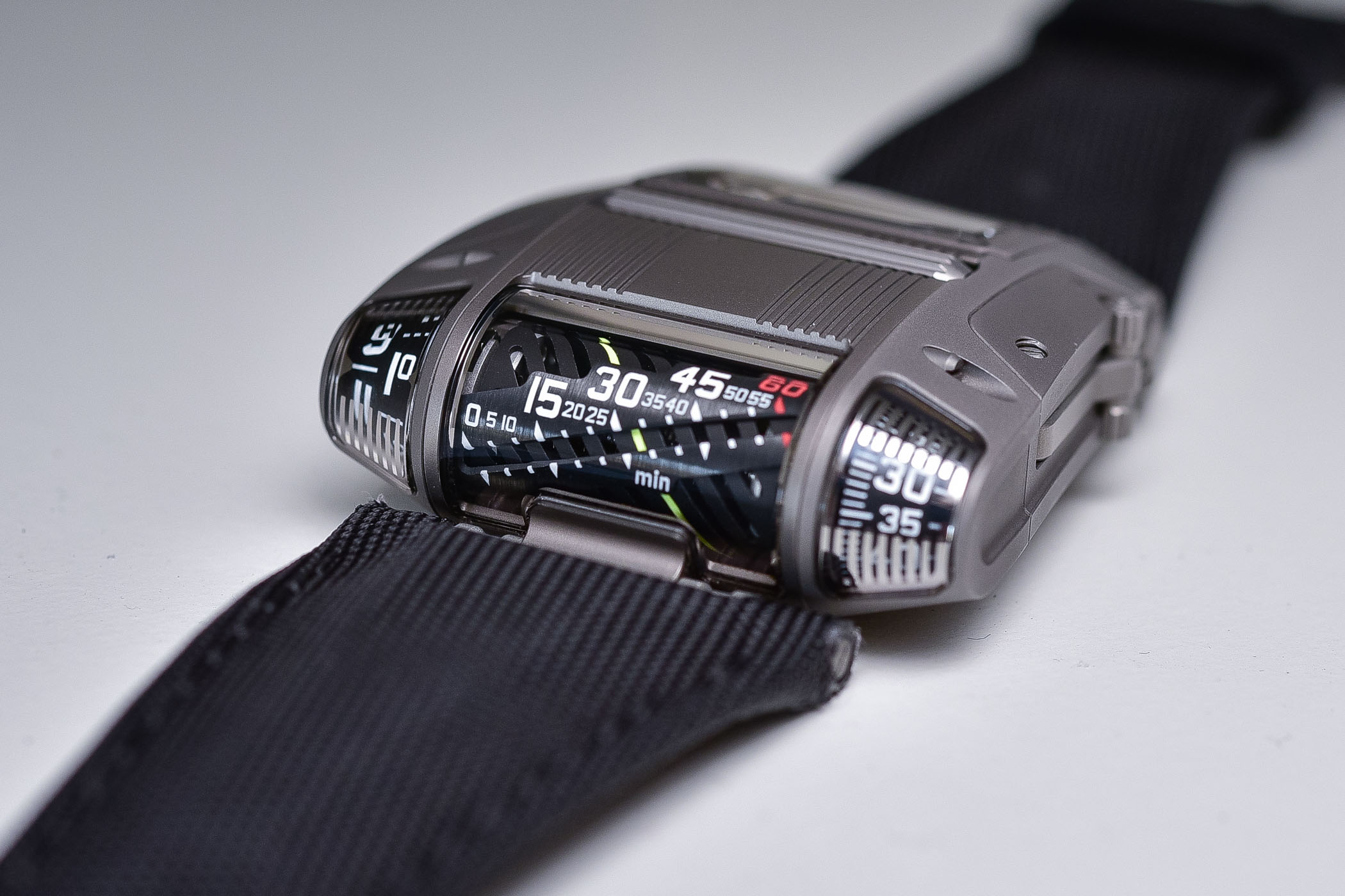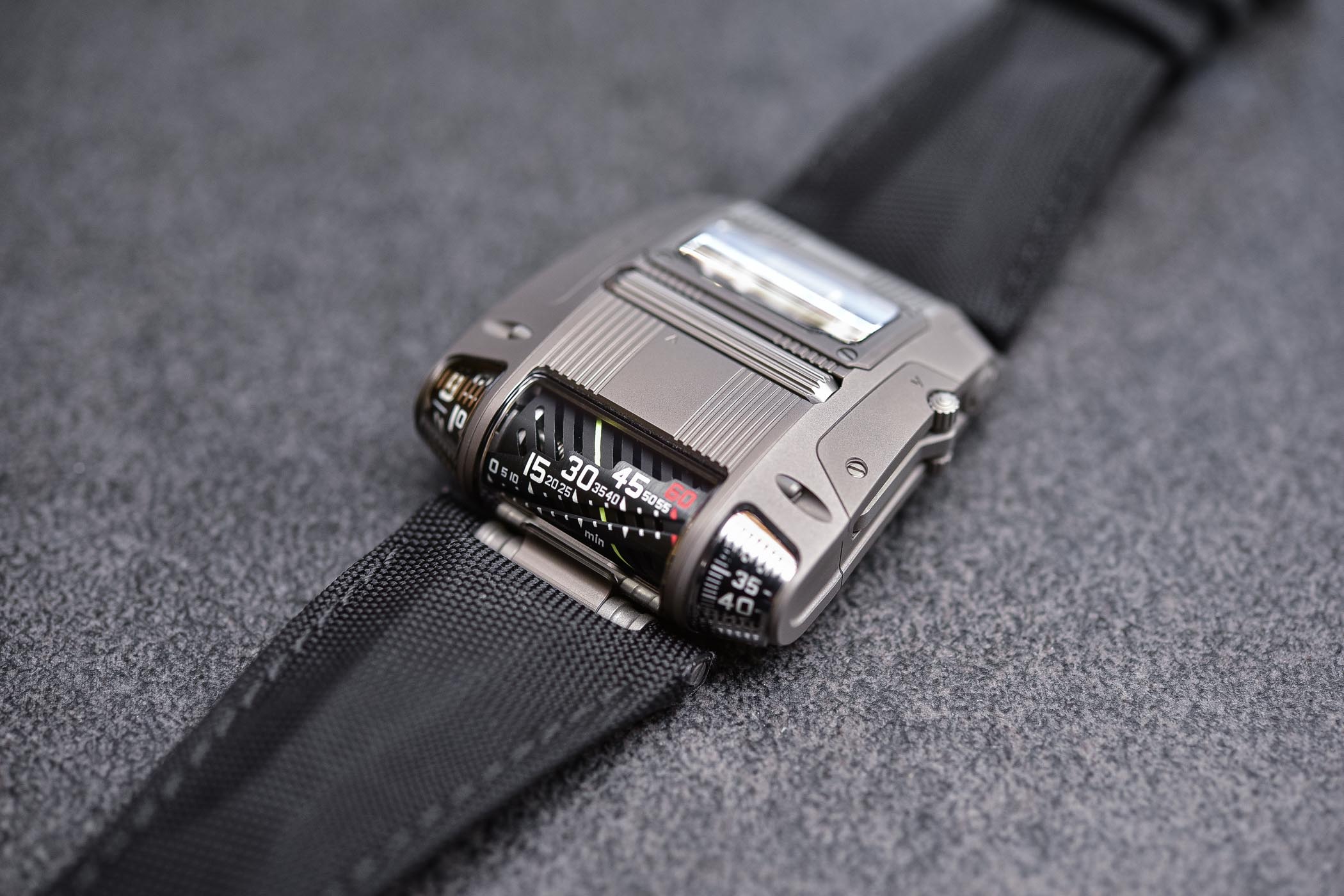 The new UR-111C shares some traits of the UR-CC1 King Cobra another dissident model that departed from the wandering hours formula by incorporating linear and retrograde indications. Like the King Cobra, the UR-111C displays the hours and minutes in a linear driver’s-style display at the front of the watch, but that’s about where the similarities end.