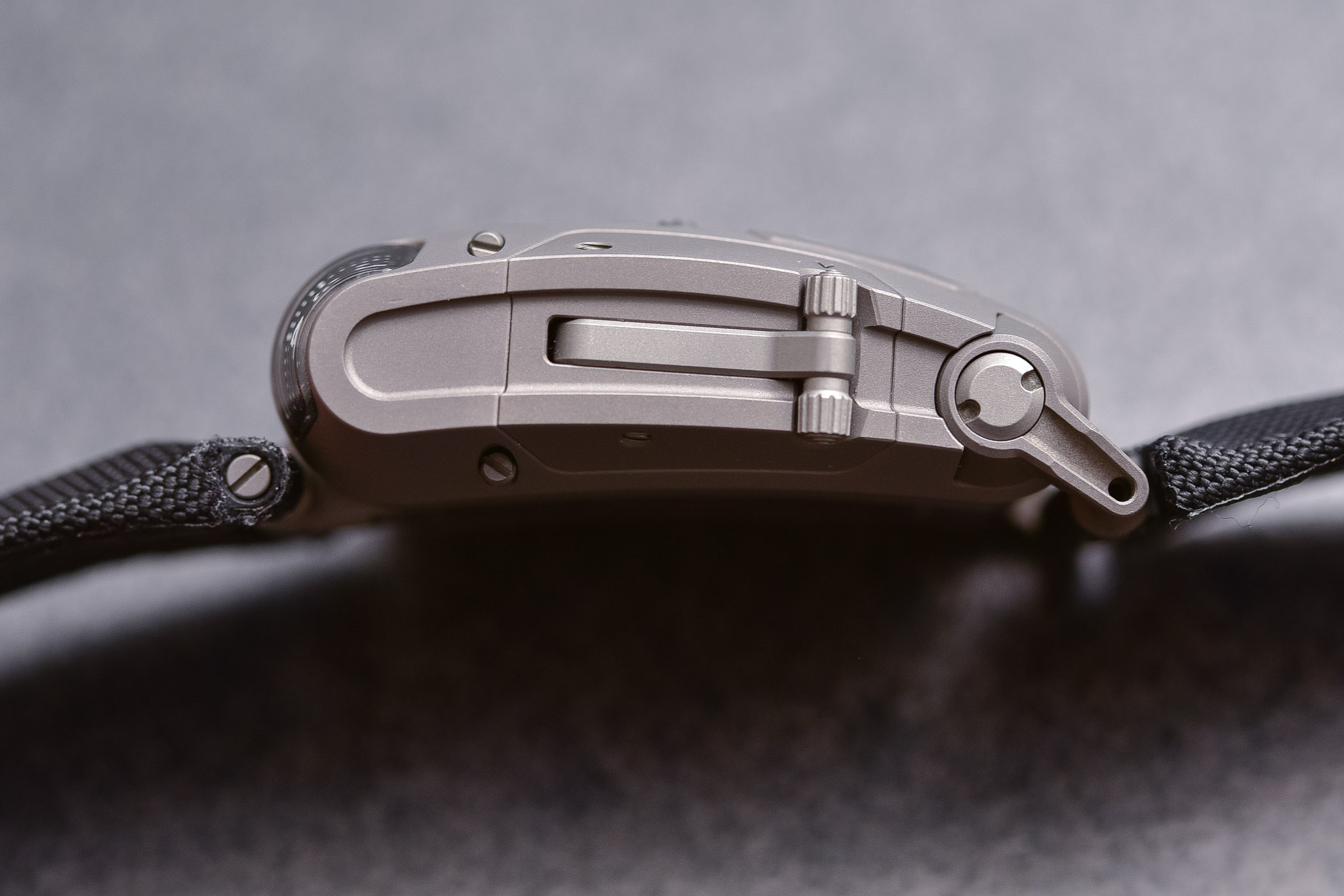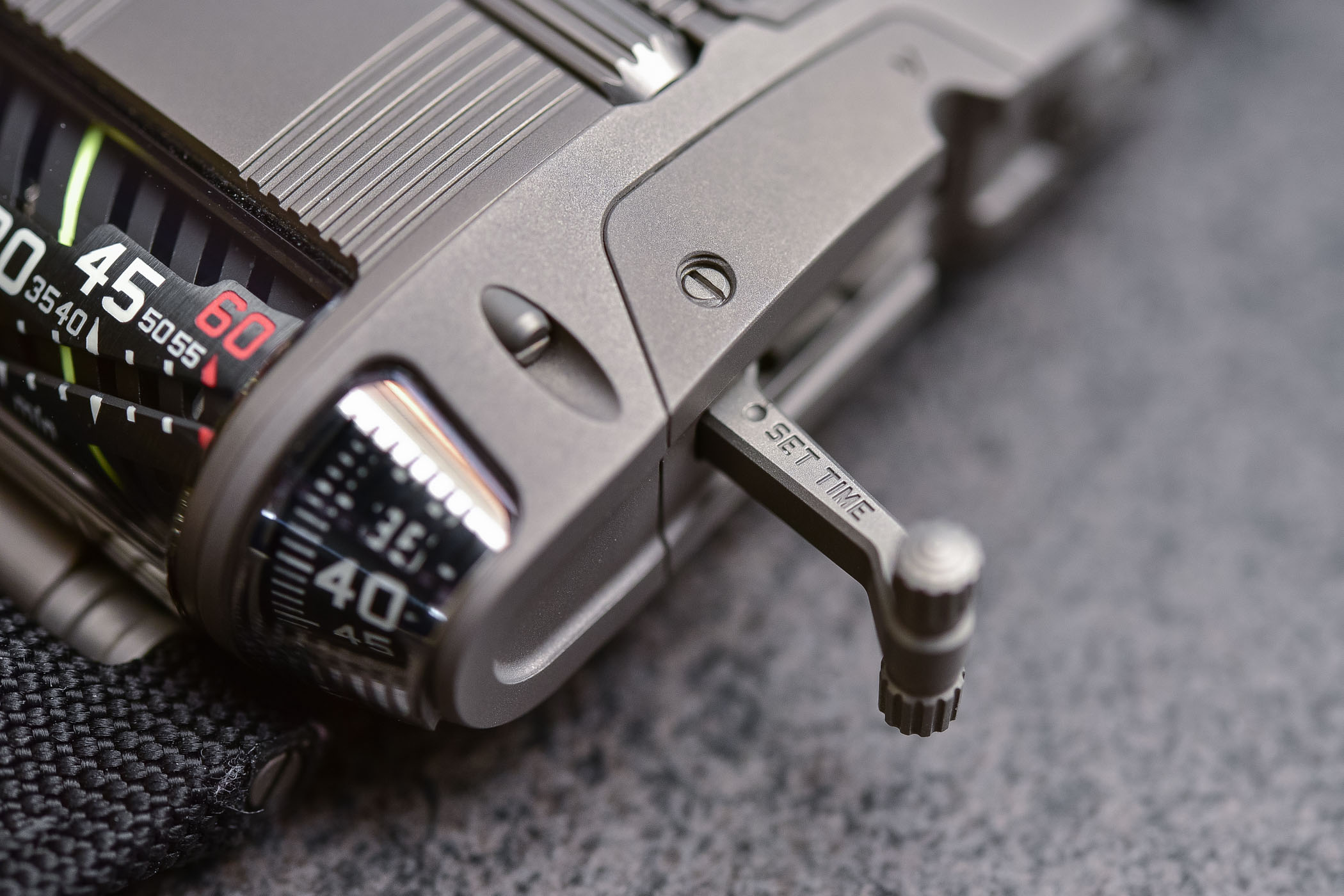 Rest assured that although the brand’s signature wandering hour display has been jettisoned in favour of other formats, this watch is Urwerk to the core. Sleek, streamlined and flight-ready, the matte gunmetal finish of the model gives the watch a stealth/industrial/Sci-Fi look that is also extremely seductive to the touch. Despite its dimensions and commanding personality, the UR-111C is much more compact than other Urwerk watches and its curved case makes it altogether wearable, even on small wrists of 17cm (as photographed). Although some of the information relayed (two separate minute registers) might not be vital, and for some even superfluous, it animates the watch no end. The original reinterpretation of the crown with the central roller is what fascinated us most about this watch and the way it invites a higher level of interaction between man and machine.