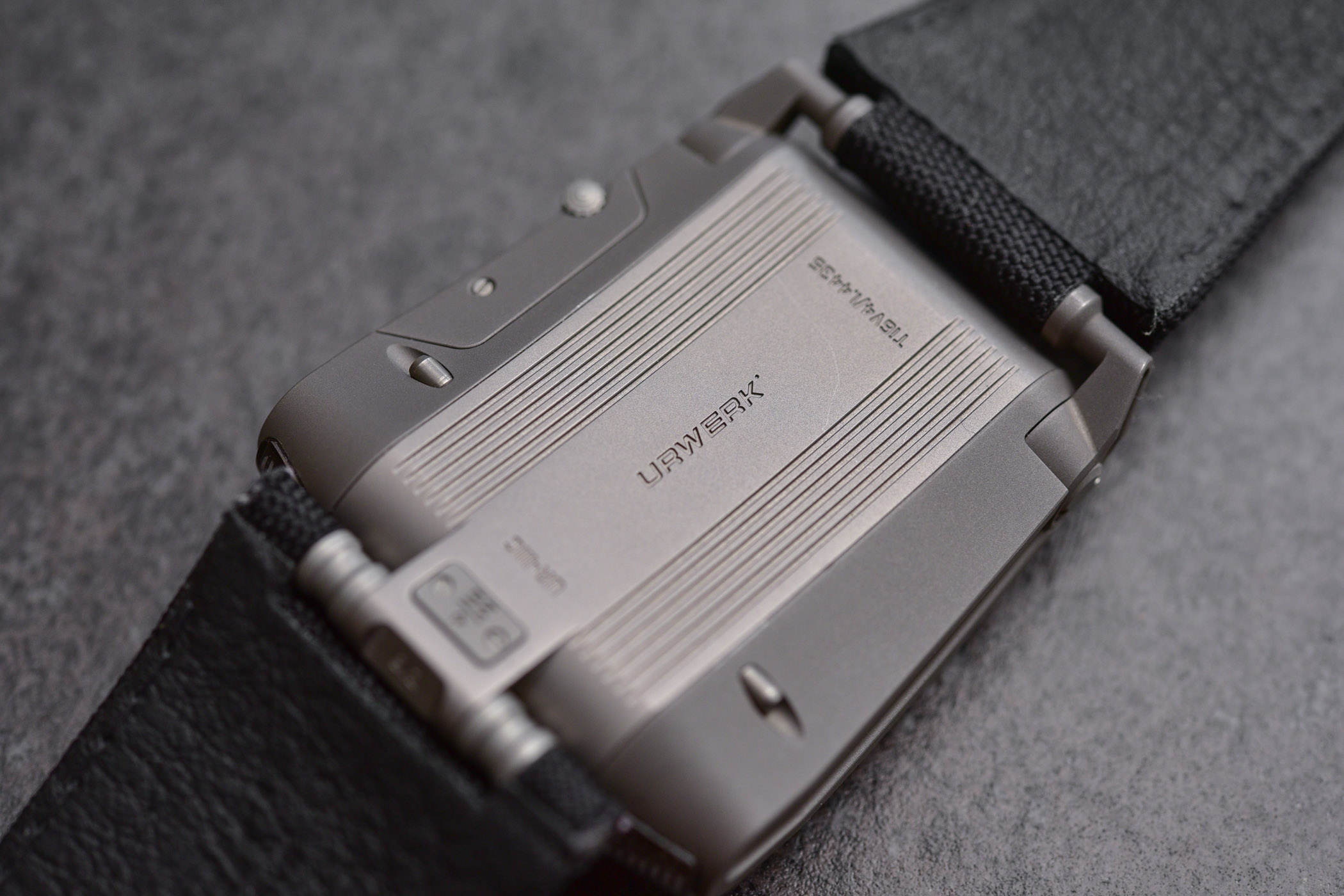 The model we had in for review was the gunmetal steel version with an inviting sandblasted matte finish that feels great to the touch. Once again, you can feel designer Martin Frei’s elegant geometric minimalism at work here. Along the lines of the American Streamline Moderne (aka ‘Art Deco on the Move’) school of the late 1930’s, characterised by sleek, aerodynamic lines emulating the profiles of trains, ocean liners, aeroplanes and cars, the case of the UR-111C features vertical speed lines on the breastplate and curvaceous indentations that bring a highly streamlined and tactile appeal to the watch.