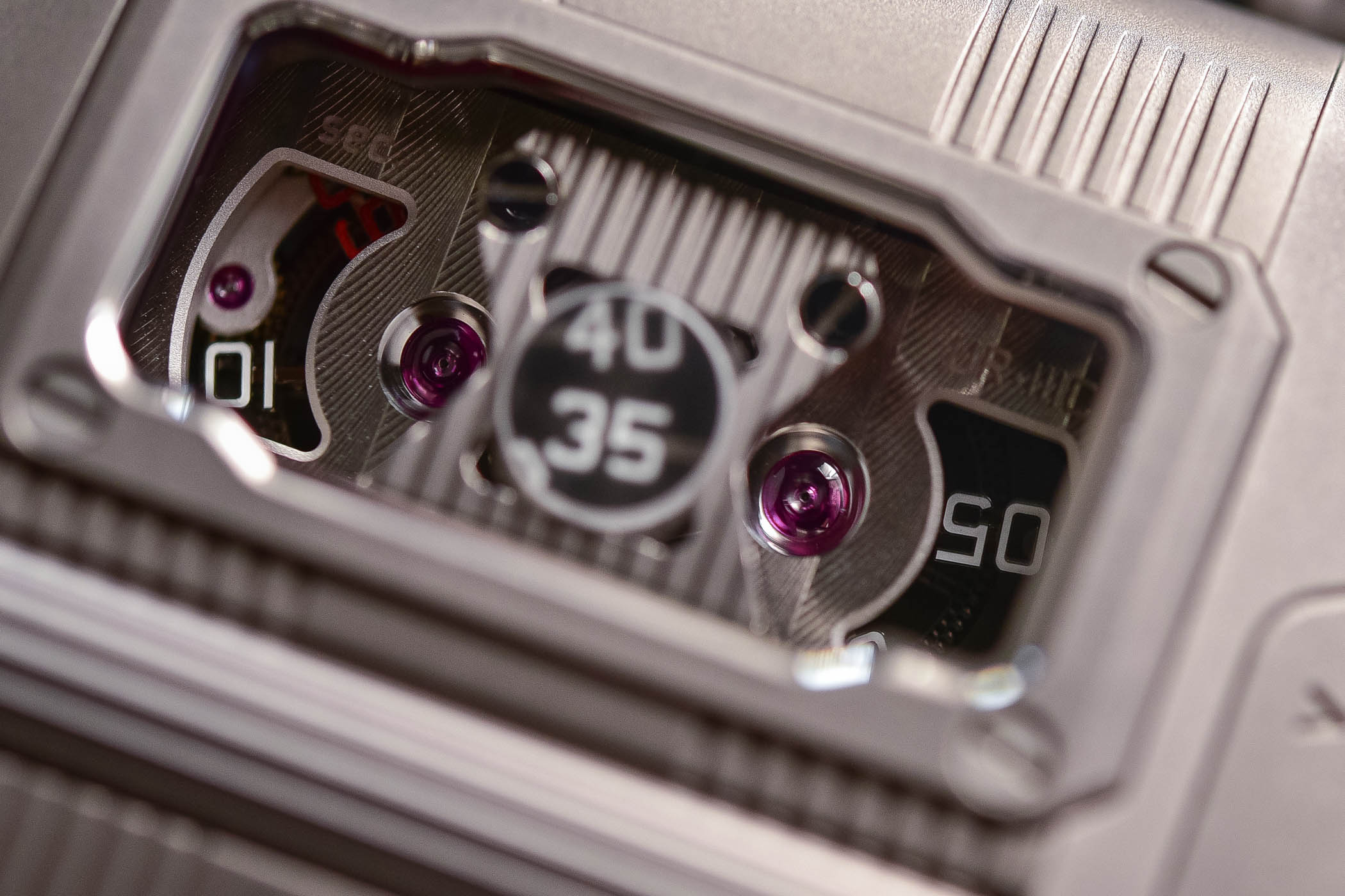Composed of two separate wheels with odd and even numbers, the fun thing here is the way the digits seem to push up against the glass, as if they were located closer to the surface than they actually are. Instead of a conventional Cyclops lens, Urwerk has performed a world first in watchmaking by using optical fibres (an image conduit) positioned 1/10th of a millimetre above the numerals to create the illusion of proximity, while in reality the numbers are ensconced far below. Although it takes a bit of adaptation to get used to reading the different time formats, you can’t complain about a boring, conventional display!