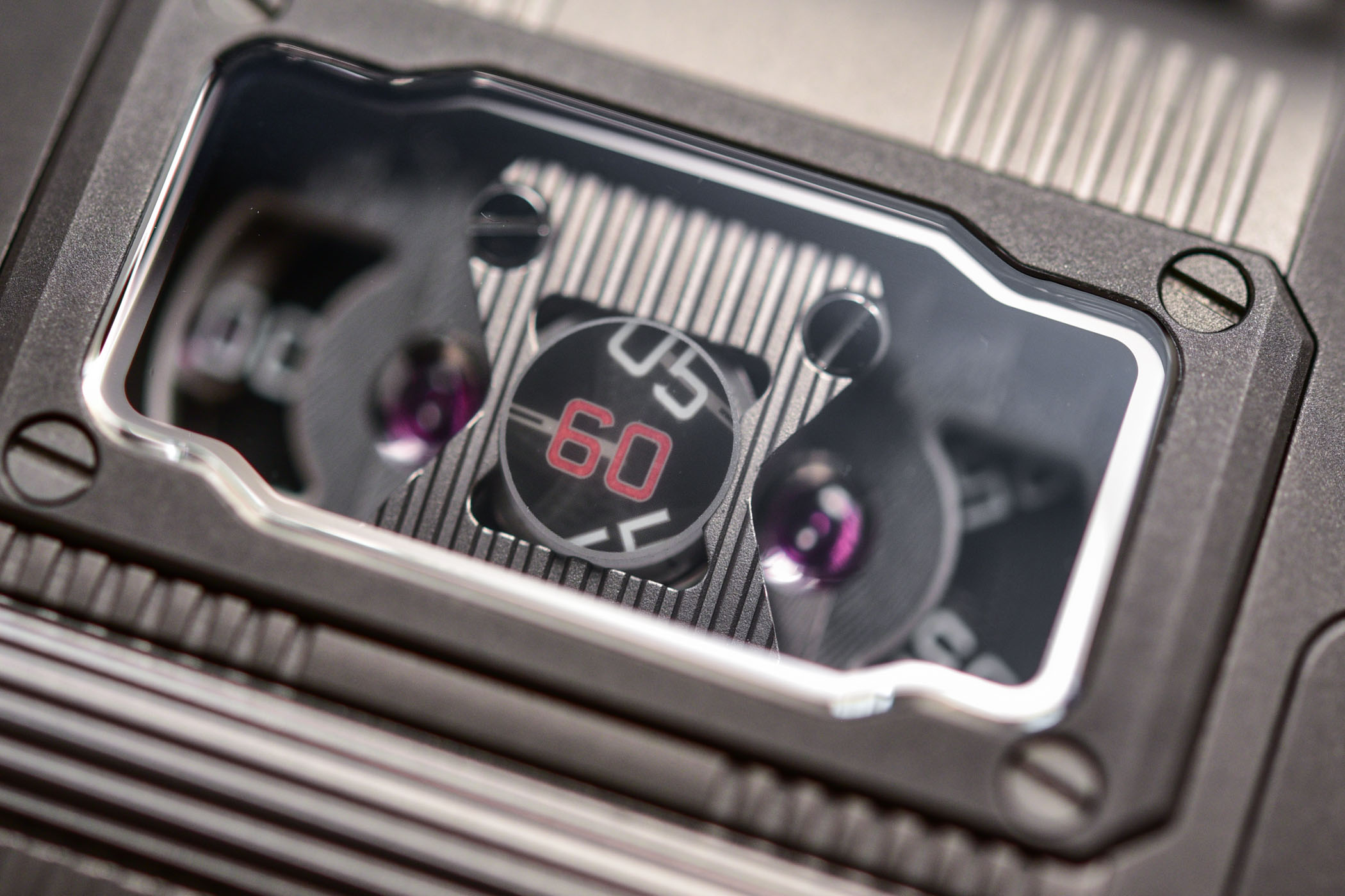 The seconds are given their very own cabin on board the UR-111C and are located underneath a large sapphire glass aperture towards the top end of the case, bolted down with four screws – in keeping with the industrial design ethos of Urwerk. Reminiscent of the window on those front-loading cassette recorders of yesterday, the round digital seconds counter below seems to float very near the surface. For a more detailed explanation of the miniature mechanics involved here, Brice’s article elucidates it all.