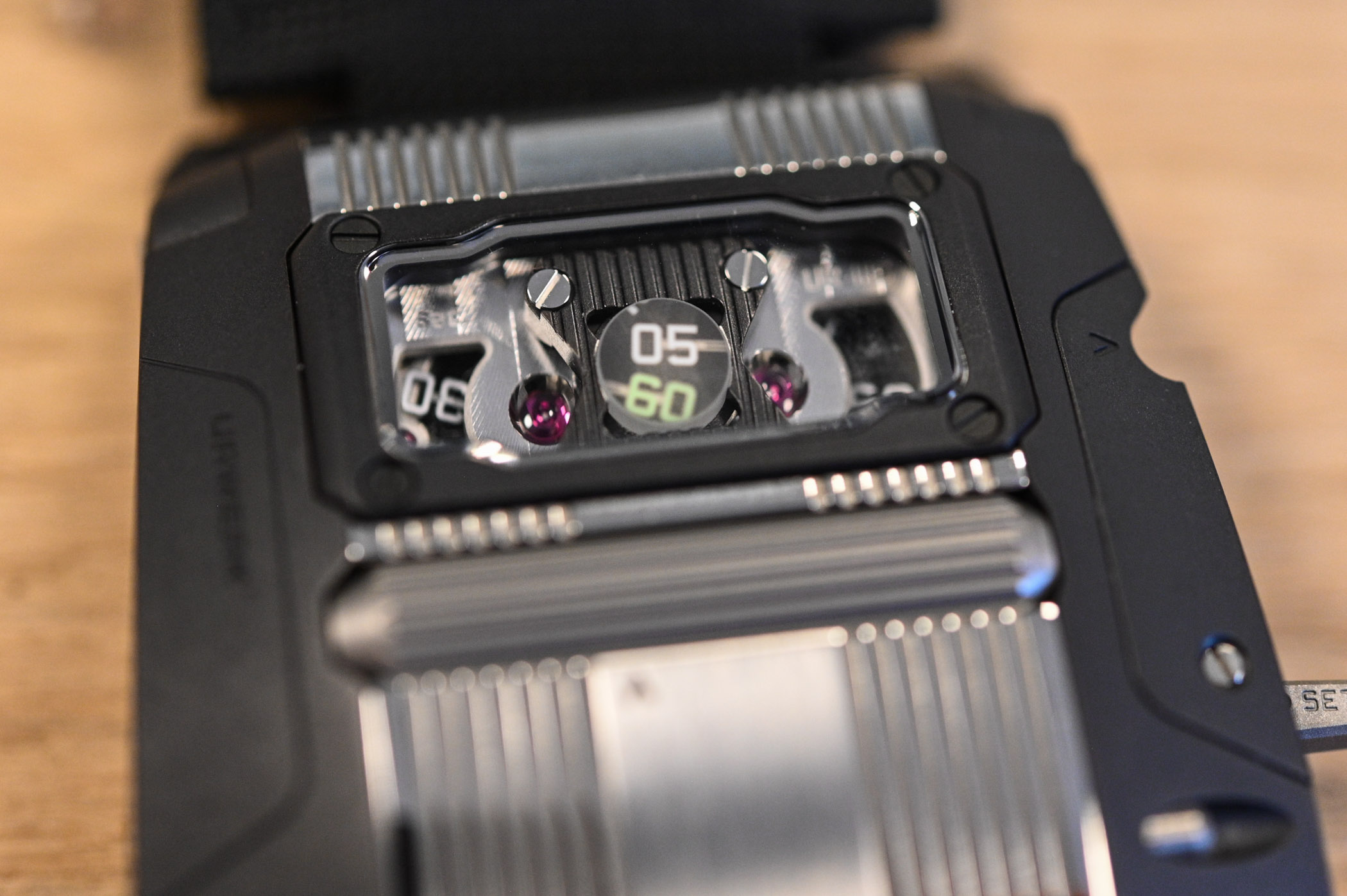 But that’s not all, as there are more things happening with this URWERK UR-111C Two-Tone. On top sits a seconds indication, composed of two separate wheels with odd and even numbers. The fun thing here is the way the digits seem to push up against the glass. Instead of a conventional Cyclops lens, Urwerk has performed a world-first in watchmaking by using optical fibres (an image conduit) positioned 1/10th of a millimetre above the numerals to create the illusion of proximity, while in reality the numbers are ensconced far below.