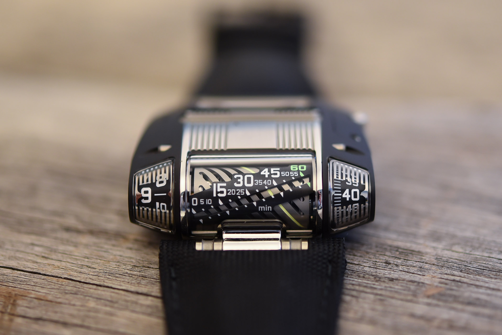 Other than that, we’re looking at the same impressive construction and design, with three portholes on the front of the watch. Like a driver’s watch, the display of the UR-111C is designed to let you consult the time without having to lift your hands off the steering wheel or flight controls. Jumping hours are read on the left side of the dashboard thanks to a rotating cone that performs a brisk jump on the hour.