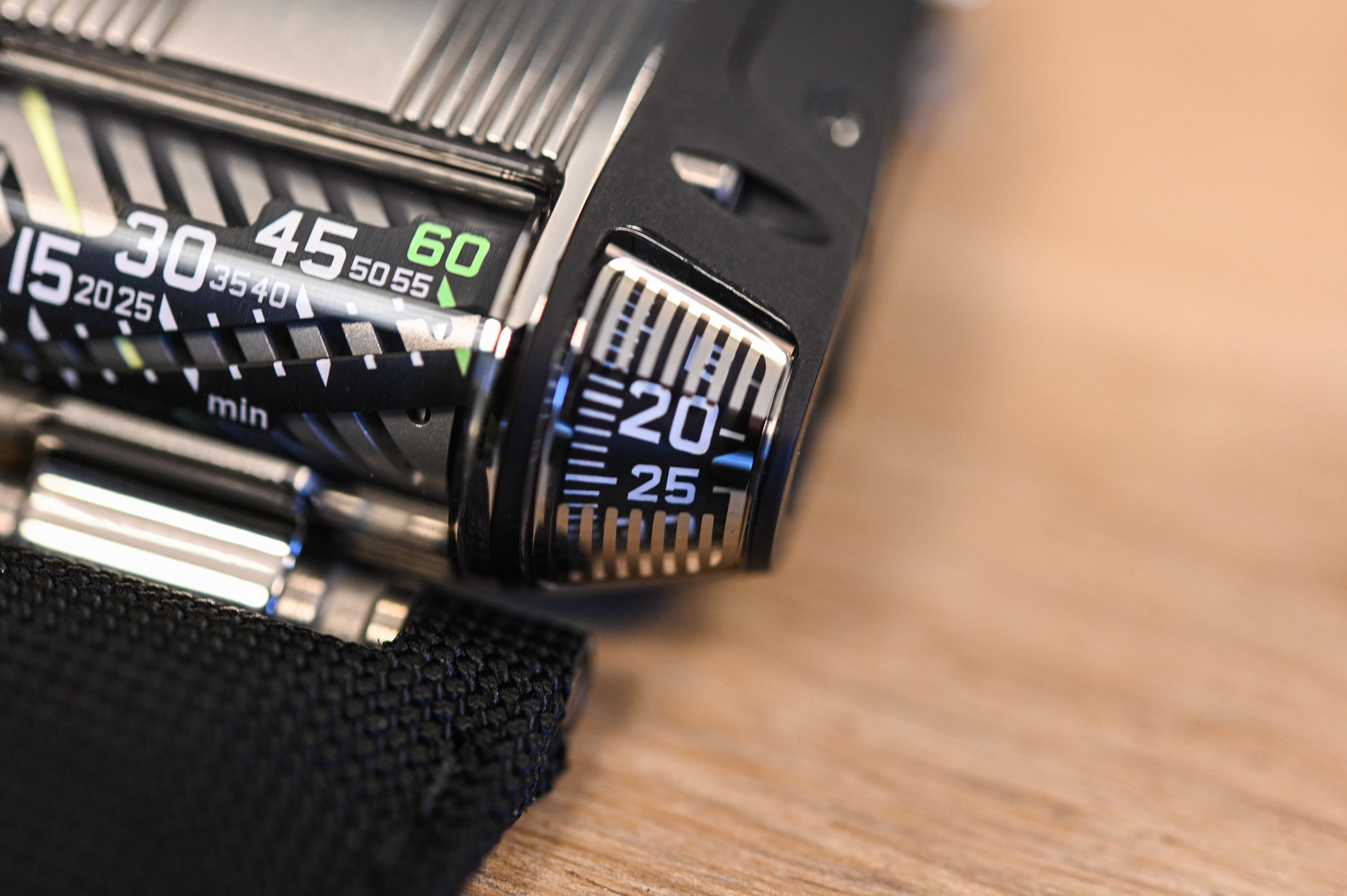 Occupying most of the allotted space in the central window is the linear representation of minutes placed along a diagonal track and read by a rotating helix with a thick yellow marker. The barrel with the minute markers is fixed and has a diagonal slash in its middle to reveal the position of the slanted yellow marker and indicate the minutes. Behind the minute barrel is another, larger barrel. Thanks to the coiled spring, the drum with the yellow marker twists its way up the minute track and, upon reaching the red 60-minute marker, performs a larger, instantaneous jump back to zero forcing the hours to jump ahead. Finally, the cone on the right repeats the minute readings in a rotating display, providing the watch with two very different formats to consult the minutes.