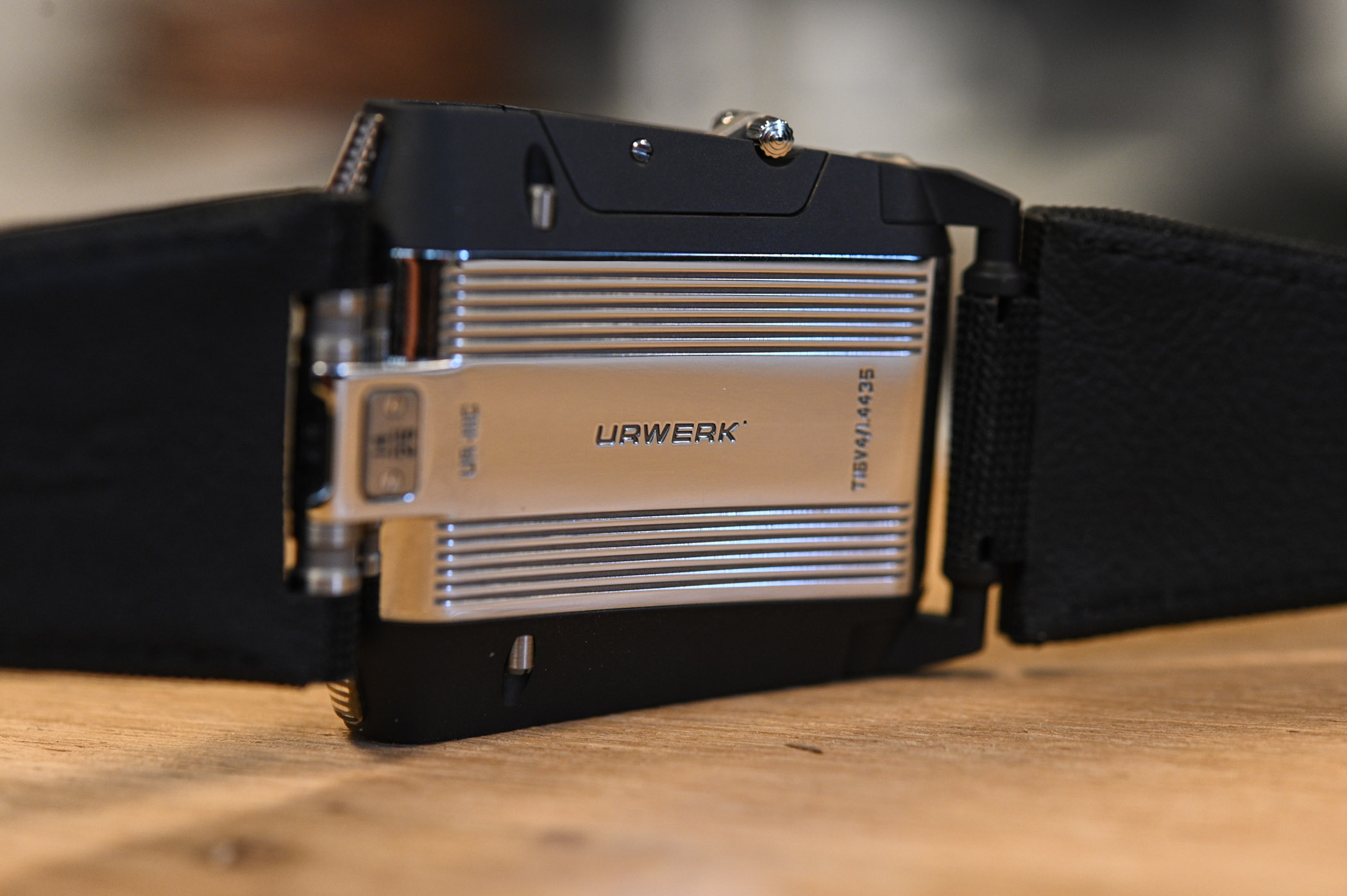 This new version is a visual update of the already existing models with new colours and finishes. The case of this UR-111C Two-Tone plays on its architectural design to mix colours. The central part of the case is executed in brushed stainless steel with polished accents and grooves. So is the central part of the caseback, entirely polished and, again, textured. The sides of this two-tone watch are executed in matte black PVD-coated stainless steel. And the watch is worn on a black fabric strap.