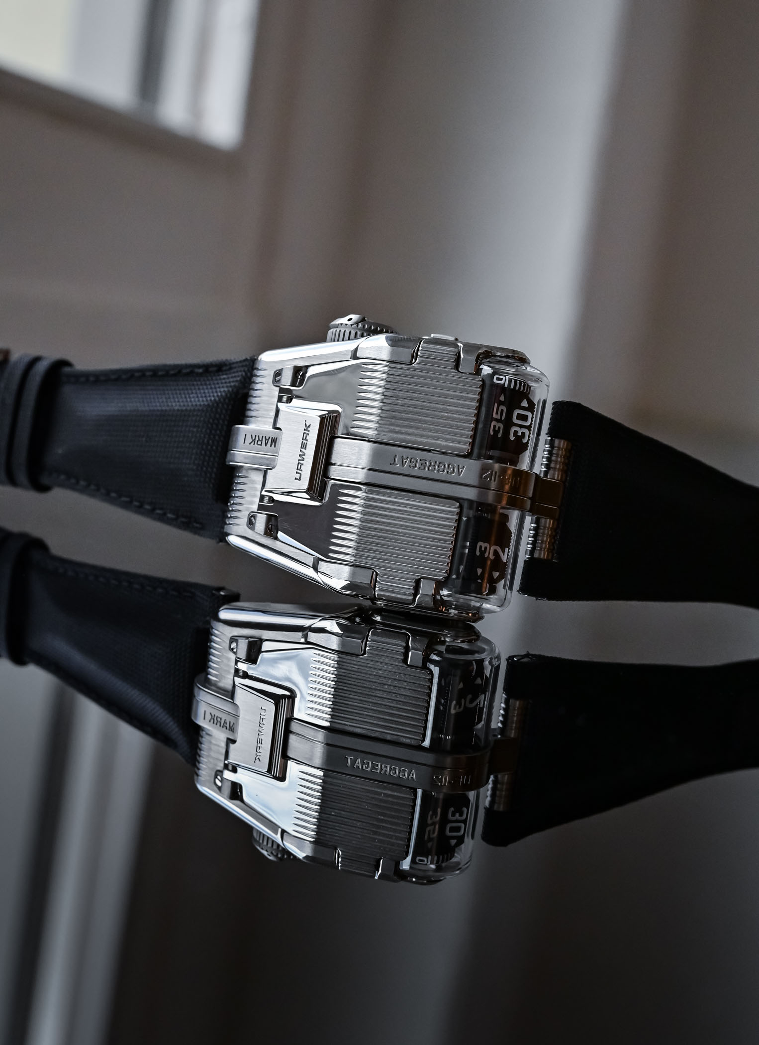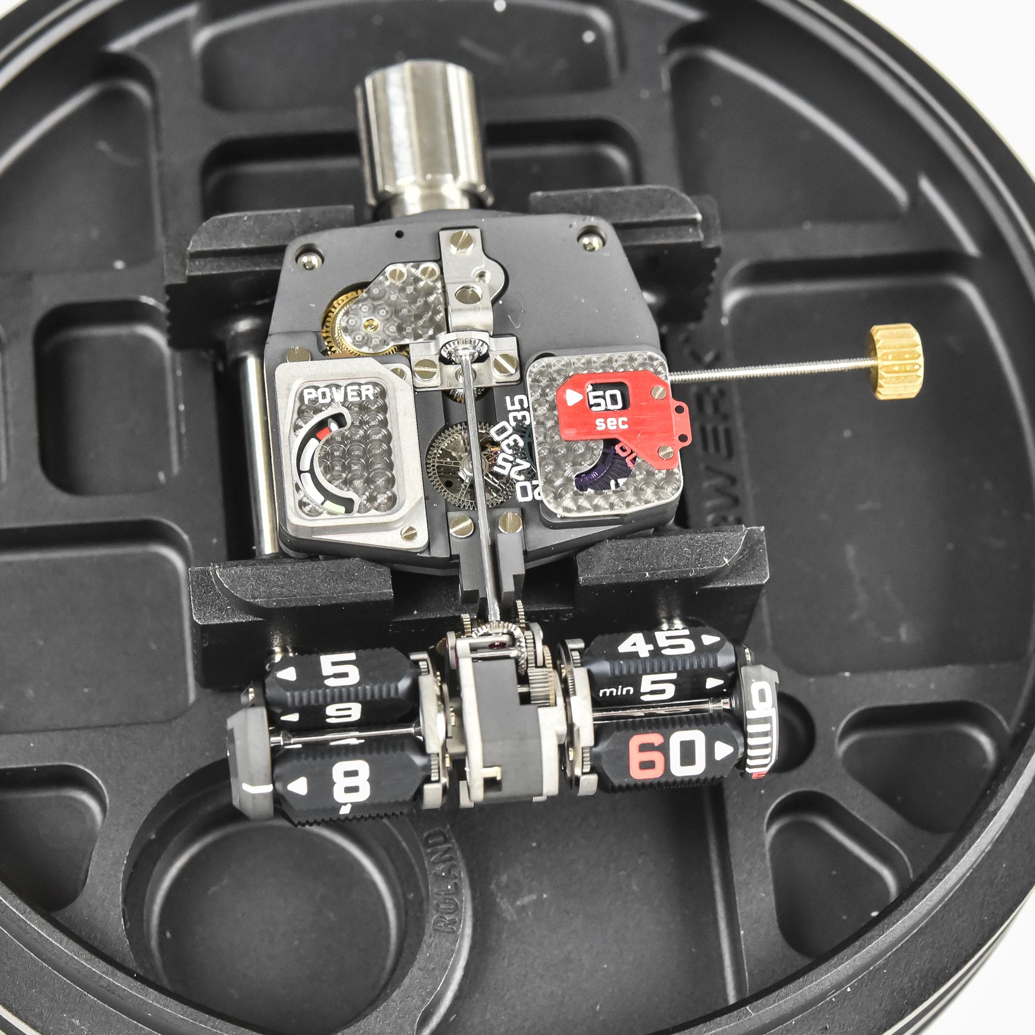 These sapphire crystal cylinders contain the timing indications for the UR-112 Aggregat Odyssee. Suspended inside are four aluminium satellites for the jumping hour indication on the left, and four satellites for the rotating minute display on the right. For the hours, single digits are engraved onto rotating prisms which jump into place as a full hour has passed. The minutes work a little bit different as the prisms show only 5-minute digits (so 05, 10, 15 etc) with an additional scale for the single minutes. Contrary to the hours, the minute prisms do not jump but gradually rotate as time passes. The prism mechanism is connected to the movement by a complex differential system with a central axle transferring the horizontal drive to a vertical motion. The UR-112 also comes with a small running seconds indication and a power reserve display, hidden underneath the flip-up hood. Sapphire crystal windows reveal the analogue PR indication, with a red plaque framing the digital seconds readout. All indications are coated in Super-LumiNova which glows in a blue hue.