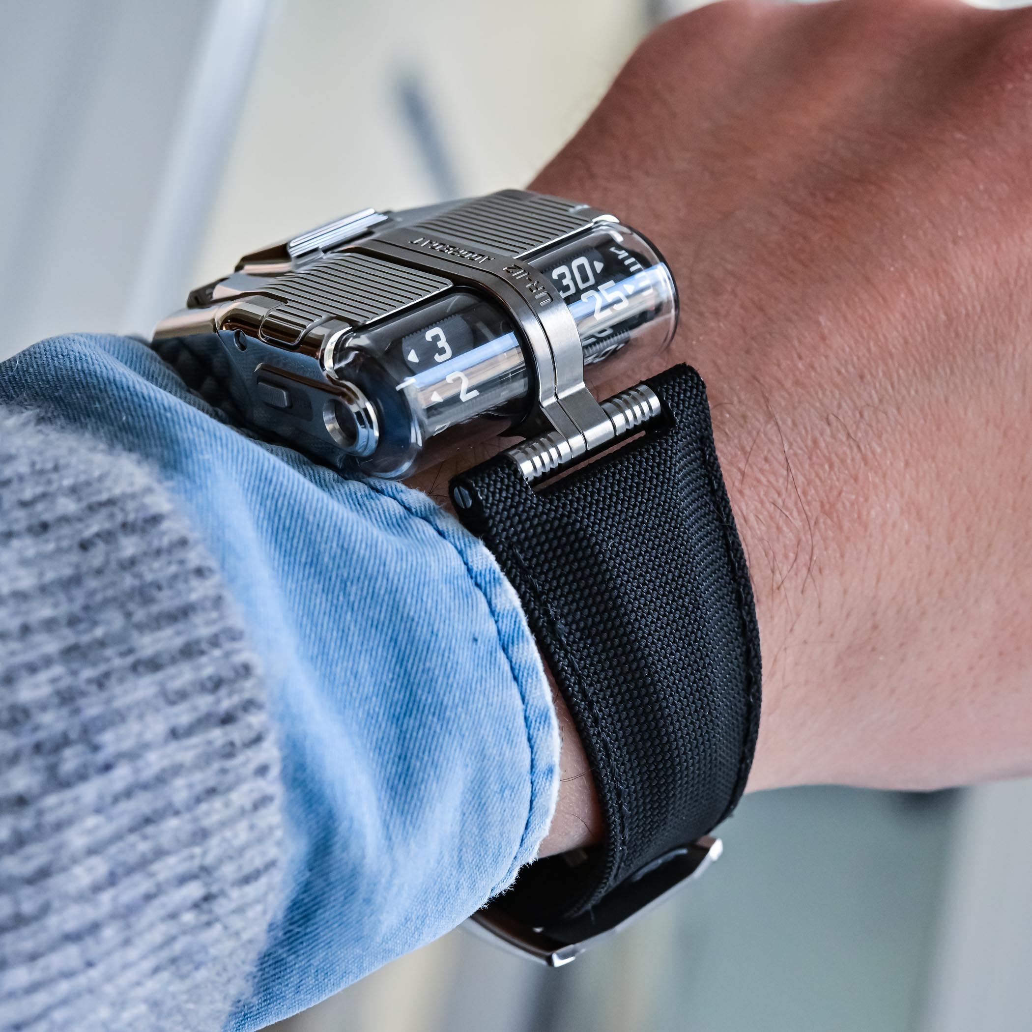 As most Urwerk watches go, the strap isn’t exactly standard either. Not content with a simple leather strap, as that would not match the futuristic vibe of the UR-112, Urwerk opted for a more tactical textile leather strap with padding inside to give it a more angular design. This is attached to the case through a very distinct lug construction if you can call it lugs at all. The strap starts almost as wide as the case before tapering down to a more sensible width and ending in a titanium pin buckle. The whole section is reinforced with a leather strap. Now, the UR-112 Aggregat was never going to be a big seller for the brand due to its complexity. Watches like this tend to take quite a bit of time to assemble so put pressure on a brand’s production capacity. Hence the reason why the original UR-112 Aggregat was limited to 25 pieces, and the UR-112 Aggregat Odyssee we’ll be produced in even lower numbers. The price for all of this mechanical wizardry is an eye-watering CHF 250,000.