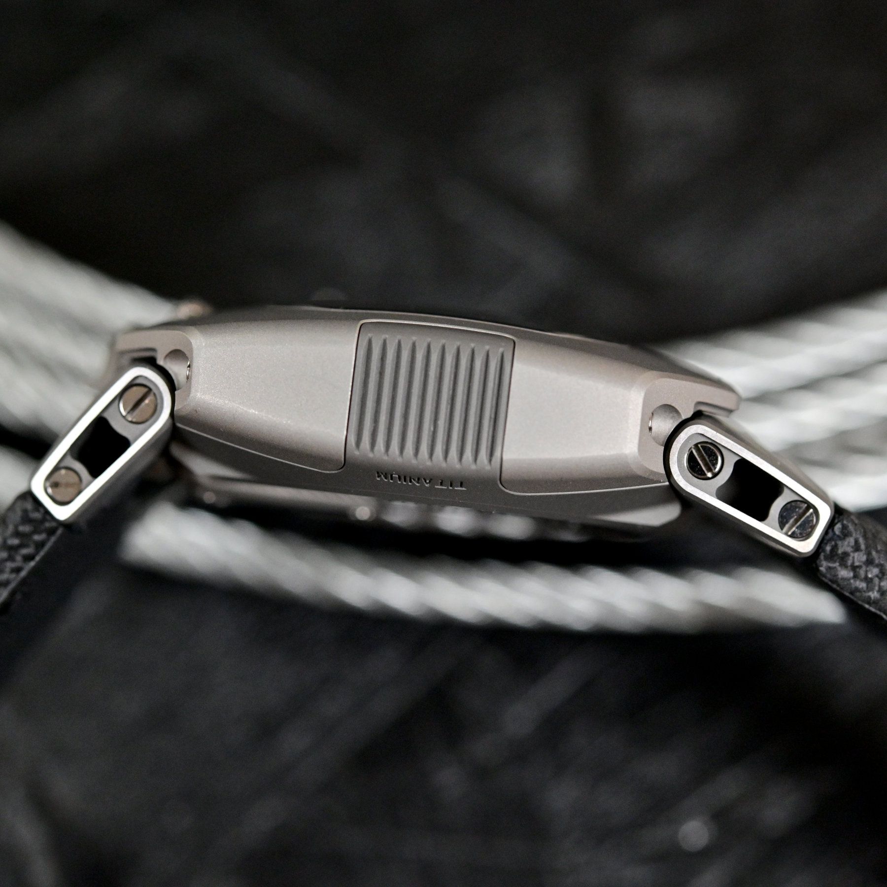The sandblasted titanium and steel case looks and feels very tactile, and has a uniquely shaped curved sapphire crystal covering the dial. A second sapphire crystal is integrated into the caseback, revealing part of the mechanical movement inside. As with other watches by the indie watchmaker, the crown is shrouded and positioned between the lugs at the top. The use of this crown is surprisingly easy! Pull it out from the underside, rotate it to set the watch, and then push down on the shroud to lock it back in place.