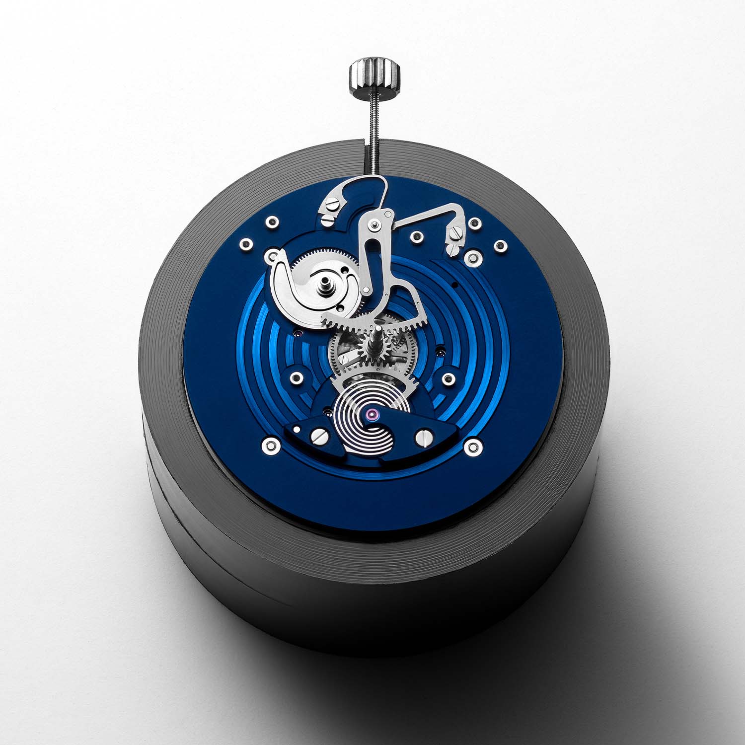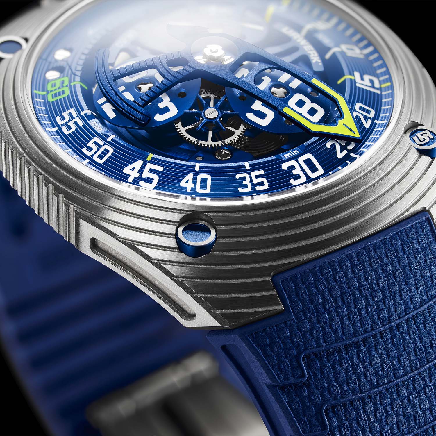 The pronounced domed sapphire crystal provides an exceptional view of the mechanical spectacle unfolding on the dial. With its new makeover, the three aluminium domed hour satellites, mounted on the rotating flying carousel, are now treated with a blue ALD colour treatment. The active satellite, indicating the current hour, is framed by a blue openworked retrograde hand with a neon yellow tip. Advancing along the 240° arc of the blue grooved minutes track, when the retrograde hand hits 60, it whips back at lightning speed to 0 while the three blue satellites pivot on their axes, simultaneously rotating 270°.