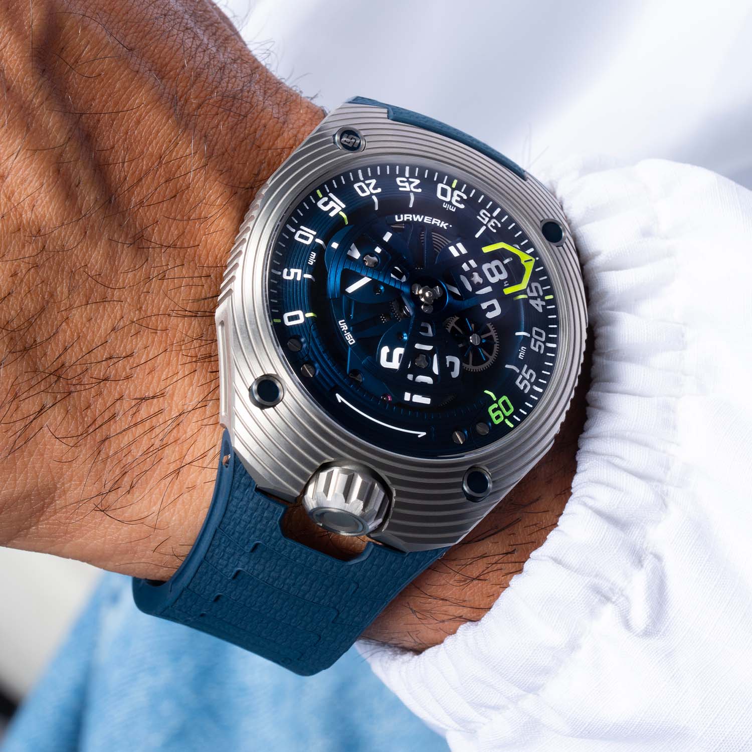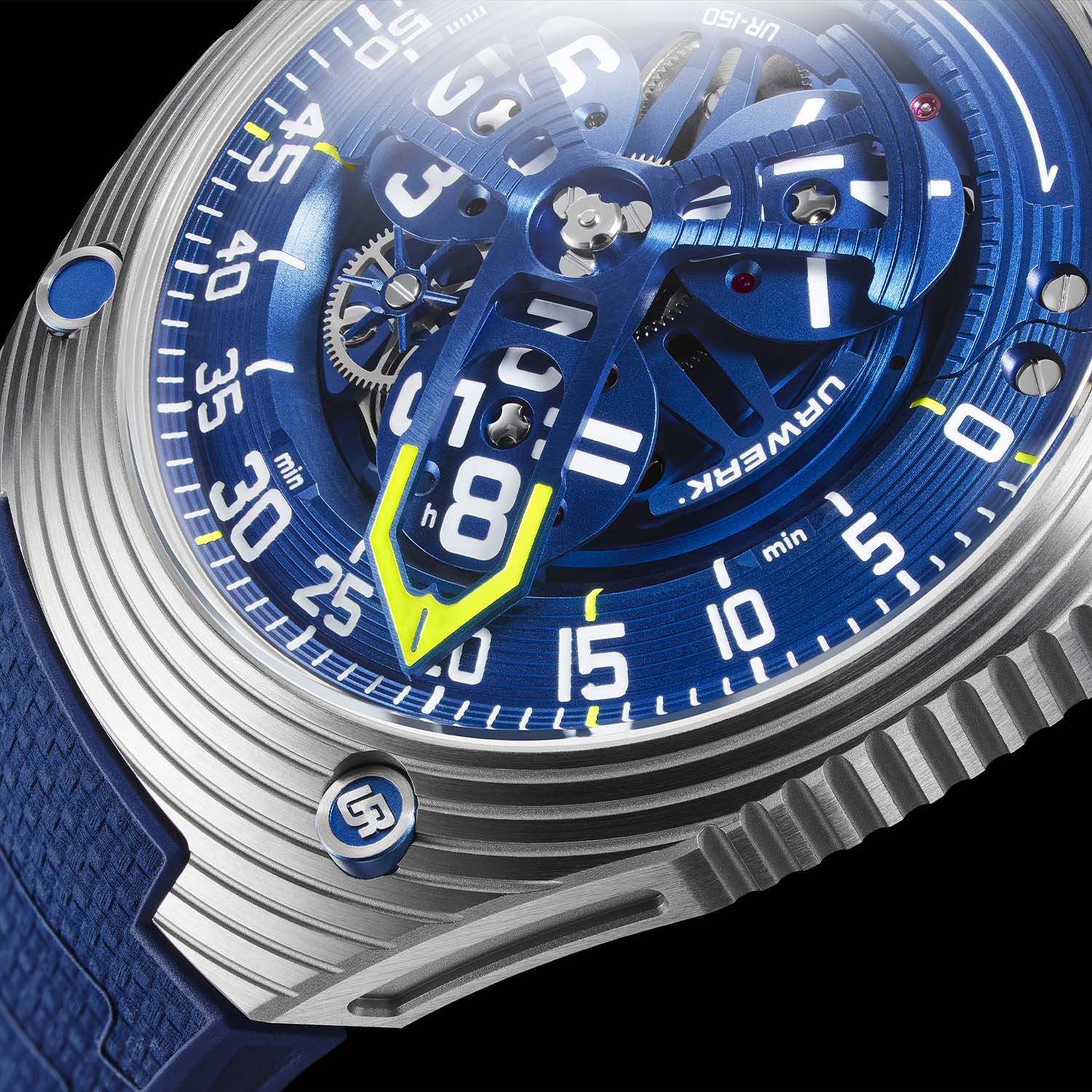 Introduced last year, the sloping steel case middle of the UR-150 Scorpion is sandblasted but now features a series of concentric grooves, similar to the streamlined speed lines applied to the UR-105. The case is secured by four blue screws that attach to the titanium caseback. With a diameter of 42.5mm, a length of 51mm and a height of 14.8mm (including the domed sapphire crystal), the case definitely has wrist presence.
