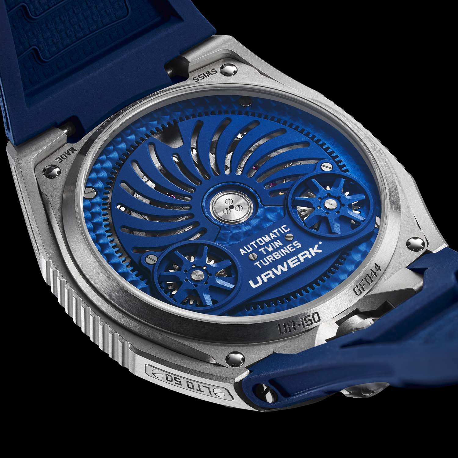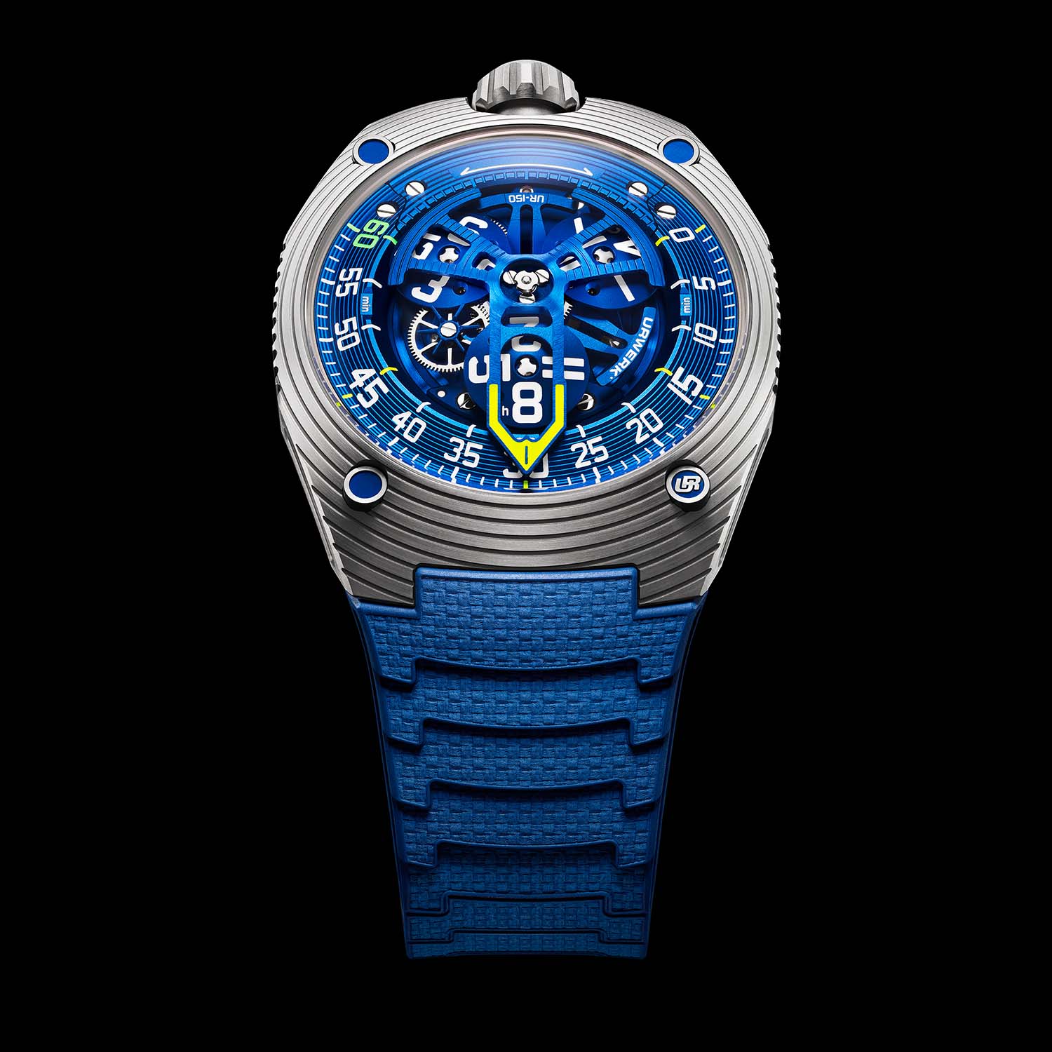 The UR-150 Blue Scorpion is paired with a supple blue rubber strap and folding clasp. It is a limited edition of 50 pieces and retails for CHF 90,000. More information at urwerk.com.