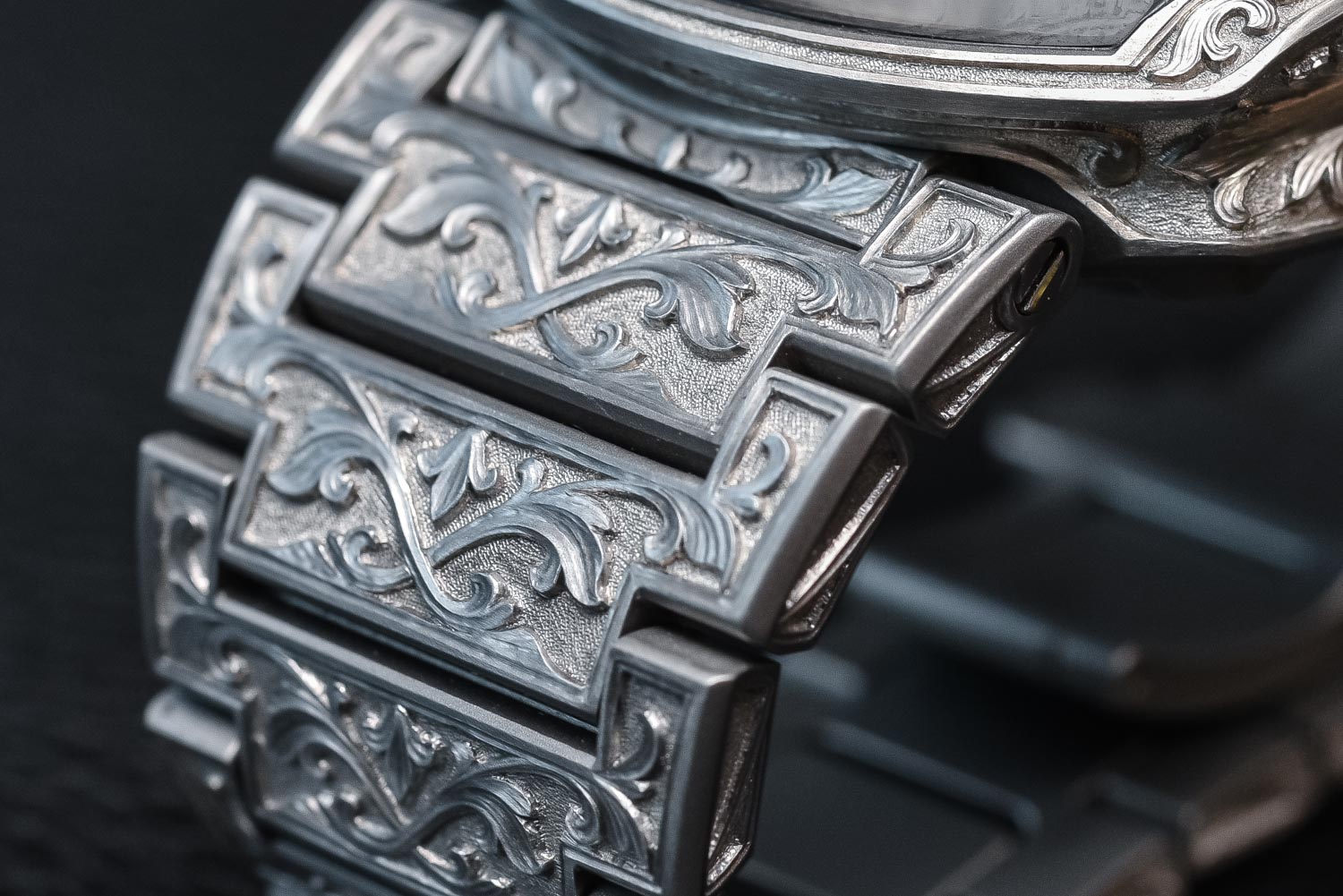 To celebrate the 20th anniversary of the brand (launched at Baselworld 1997), Frei and Baumgartner have decided to use one of their flagship models, the futuristic UR-210S, to create a provocative statement, based on a complete anachronism. For this retro-futuristic move, the UR-210 was transformed by the expert hands of a talented engraver, Florian Güllert. “The decoration is very post-Renaissance 17th-century, but on a determinedly contemporary structure,” comments Florian. “The swirling pattern of acanthus leaves is most suitable for this style, contrasting with the angular look of the watch. We have merged the case, the crown protection and the bracelet into one unit to create an exceptional piece. I was given the entire watch to work on and I took it over to produce a design in steel.”