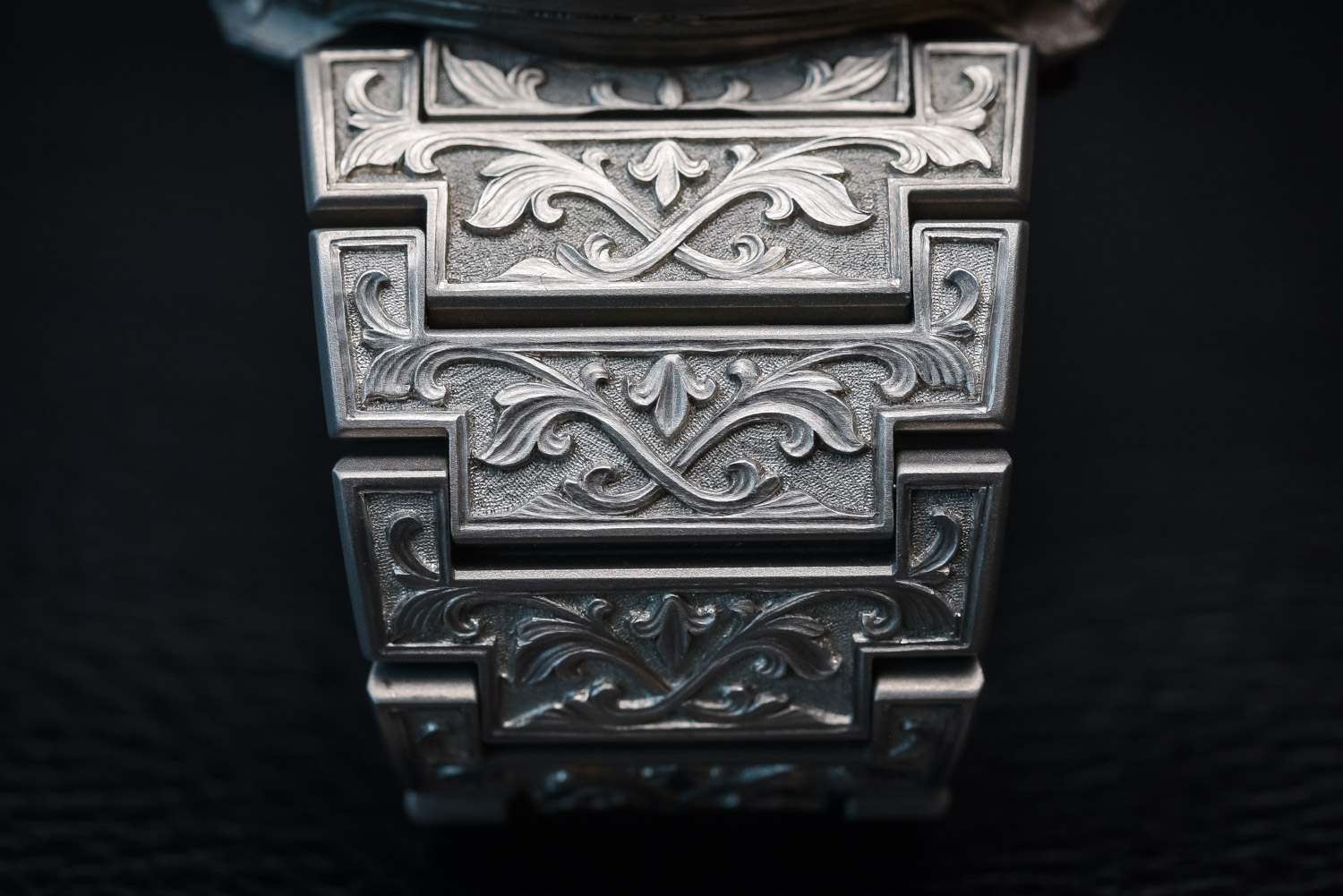 The pièce de résistance of the URWERK UR-210 Amadeus is indeed this impressive engraving work, applied on most external parts of the watch – case, bracelet, crown protection – thus covering all visible facets of the watch when worn. The result must be considered from an artistic point of view, before any judgement can be made on the aesthetics. The work done to achieve these patterns is extremely impressive. The metal is chiseled, hammered, engraved, chased and is nothing like an industrially-made surface, which we are used to seeing in watchmaking. No satined or polished finishings here, the metal is rough, textured and feels brutal, contrasting with the delicacy of the acanthus leaves motifs.